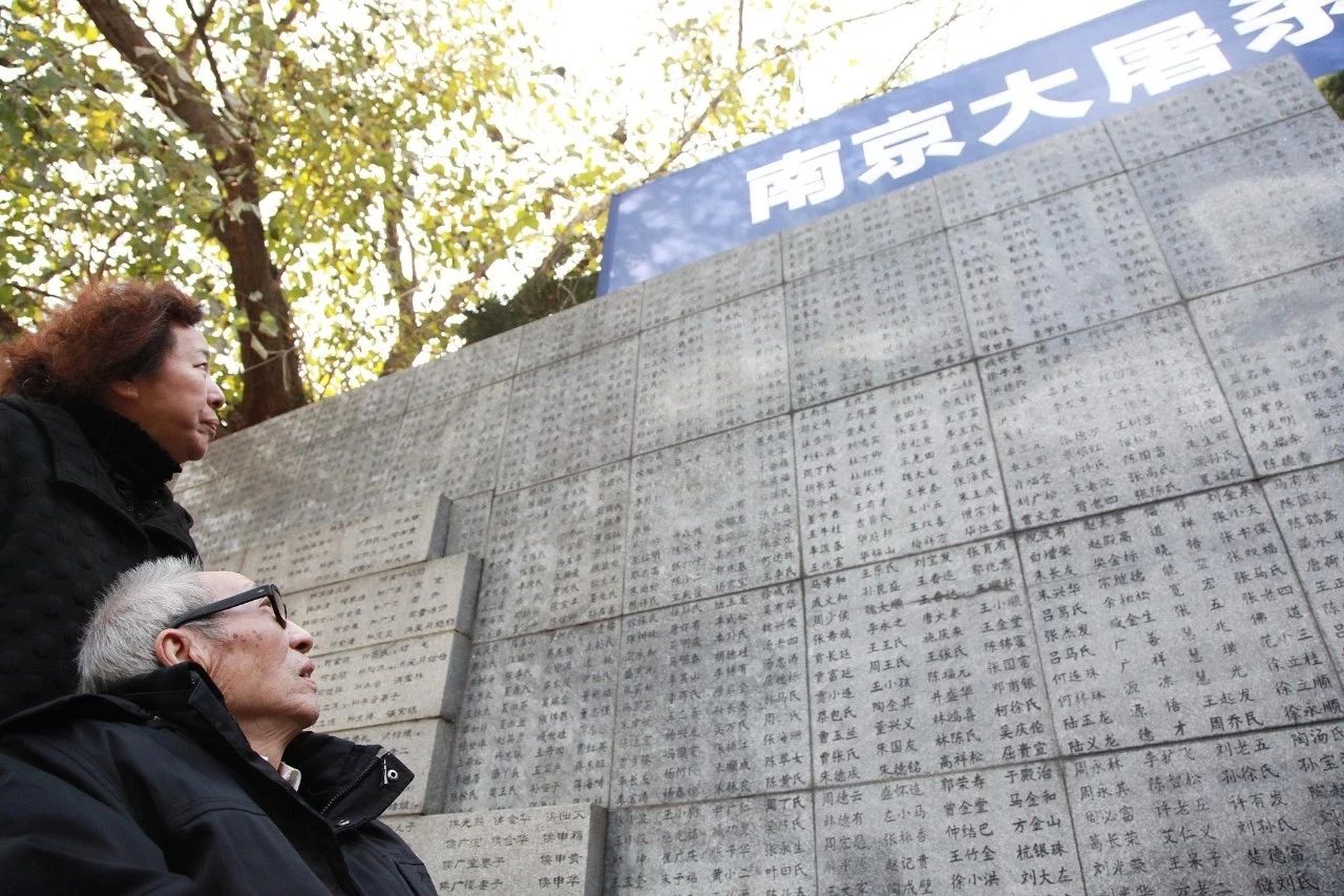 南京大屠杀幸存者余昌祥(右)注目凝视着南京大屠杀中遇难亲人们的名字