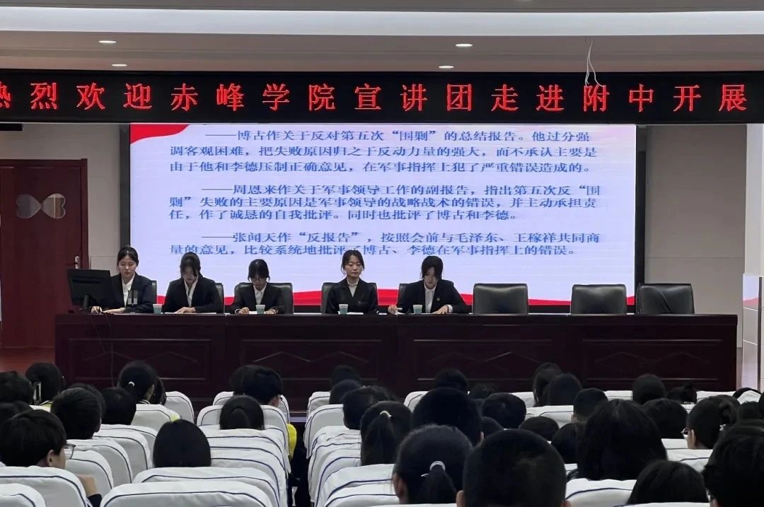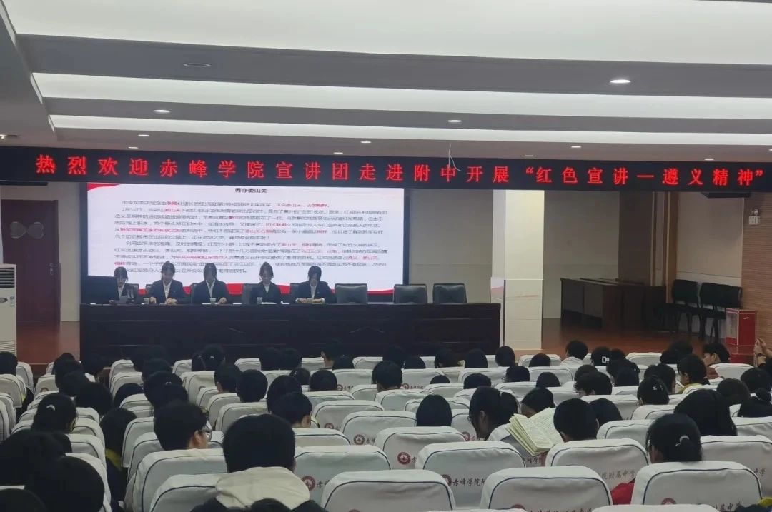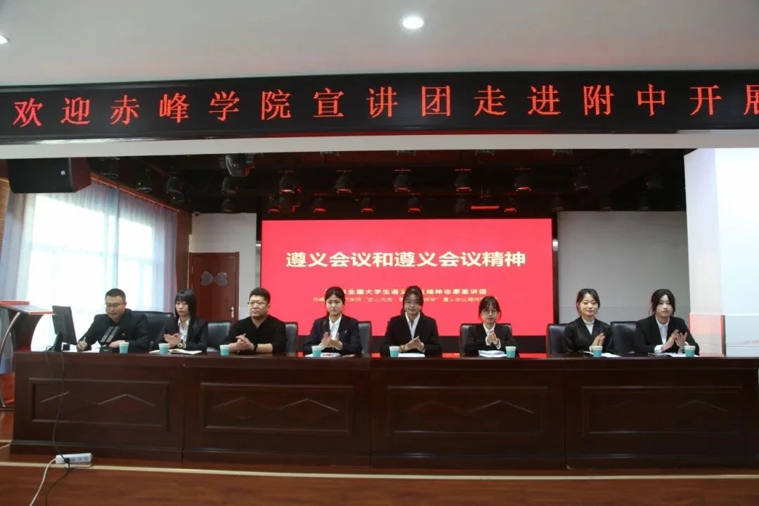 为引领青年学生传承弘扬遵义会议精神,赓续红色血脉,在遵义会议召开90周年之际,美术学院“艺心向党 青春红色筑梦”遵义会议精神志愿宣讲团于近期走进赤峰学院附属中学,为百余名师生开展了一场以“遵义会议和遵义会议精神”为主题的宣讲。