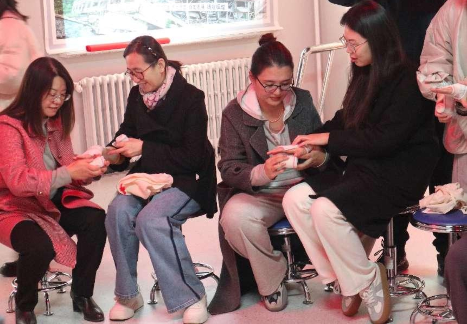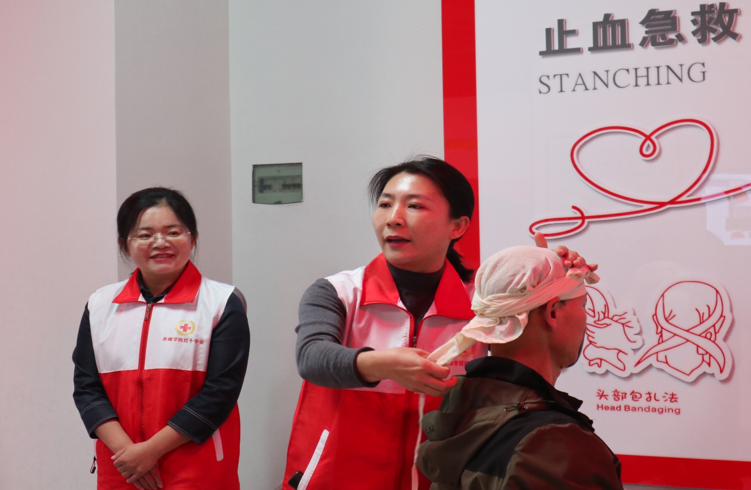 护理学院教工党支部赵莉、梁靖老师、入党积极份子温慧敏老师、教师李洪慰积极投身志愿服务,承担培训任务,为活动增添了一抹亮丽的色彩。