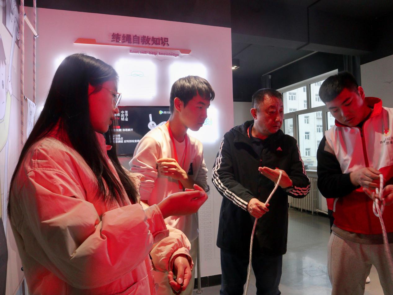 赤峰学院健康管理与应急救护科普教育基地的老师和同学们在市红十字会生命体验馆志愿者们的带领下参与了一场沉浸式的科普体验。通过模拟拨打报警电话、模拟救火、烟雾逃生以及各类绳结训练和消防知识学习,掌握火灾自救互救知识和逃生技能。