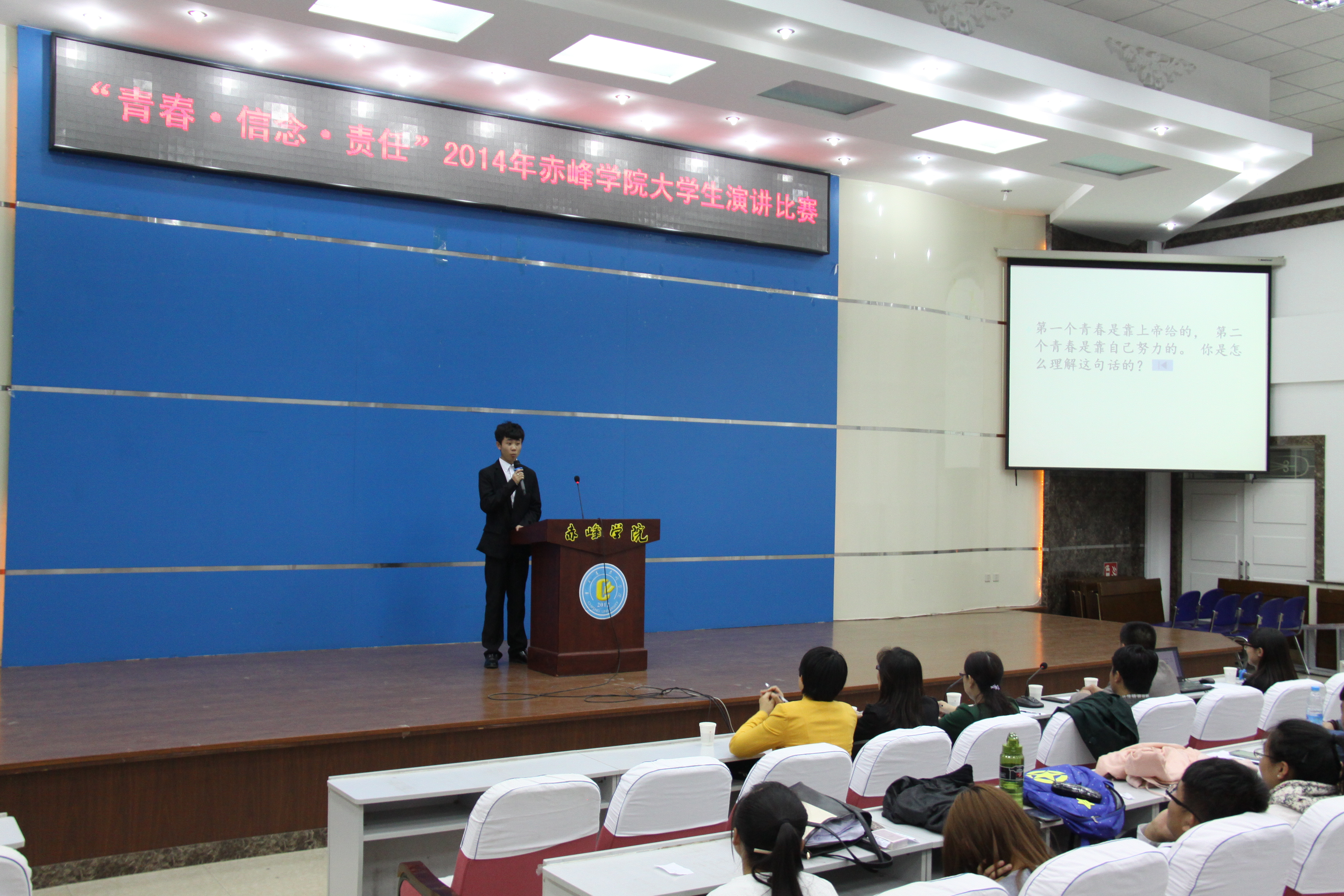 为弘扬我校优良学风,提高大学生的语言表达能力与思维应变能力,日前,由校团委主办,文学院承办的以“青春,信念,责任”为主题的演讲比赛决赛在崇学楼三楼学术报告厅举行。