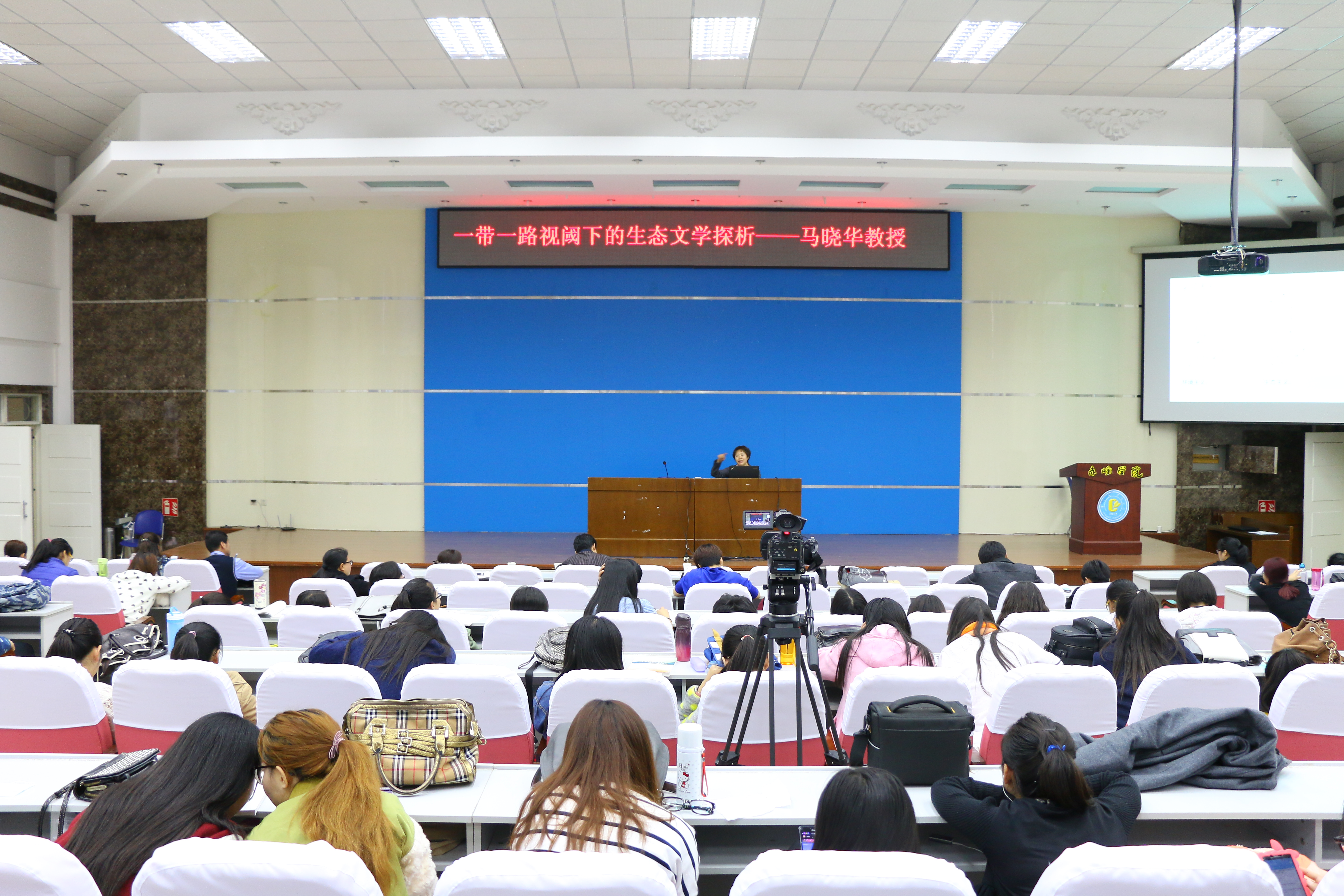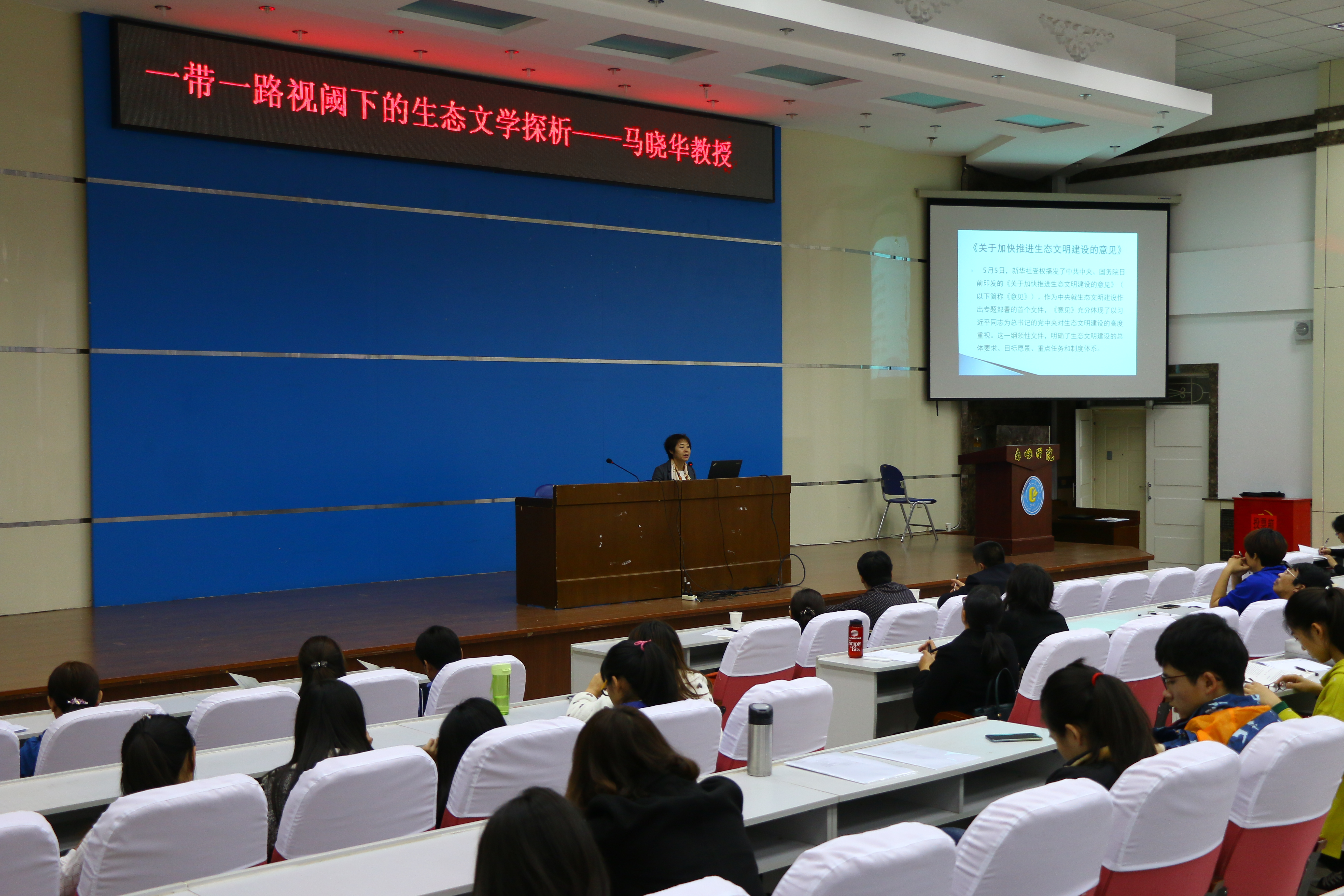 马晓华教授的学术讲座秉承“和平合作、开放包容、互学互鉴、互利共赢”的丝绸之路精神,在“一带一路”的视阈下,探讨生态文学,找寻蕴含其中的生态理想和道德呼吁,“一带一路”语境下的学术探求,旨在对“中蒙俄经济走廊”的文化交流起到积极的推进作用。此次讲座涉及以下五个方面:一、“生态文学”的界定;二、生态文学的思想界定;三、俄罗斯生态文学的伦理视角;四、从电影《狼图腾》看草原生态;五、报纸、网络中的蒙古族作家满都麦研究。马教授为我们讲解了生态文学的概念,及关于“环境主义”和“生态主义”的区分等。我们从而了解到环境文学和生态文学的不同之处,生态批评不等于生态学加文学批评,更多的是吸收生态哲学的生态整体主义思想,通过彻丽尔·格罗特费尔蒂的生态整体观和浮士德精神来体现生态在我们现实生活中的地位。最后,用阿斯塔菲耶夫的《鱼王》来论证生态主义不是复古主义,用艾特玛托夫的《白轮船》来论证渔猎文学中“人性”和“兽性”的关系,并从生态审美学的角度深刻解析了电影《狼图腾》,以蒙族作家满都麦倡导的精神深入了解了生态整体这一特性,引导我们更加推崇草原文化,发展生态文学和生态保护。