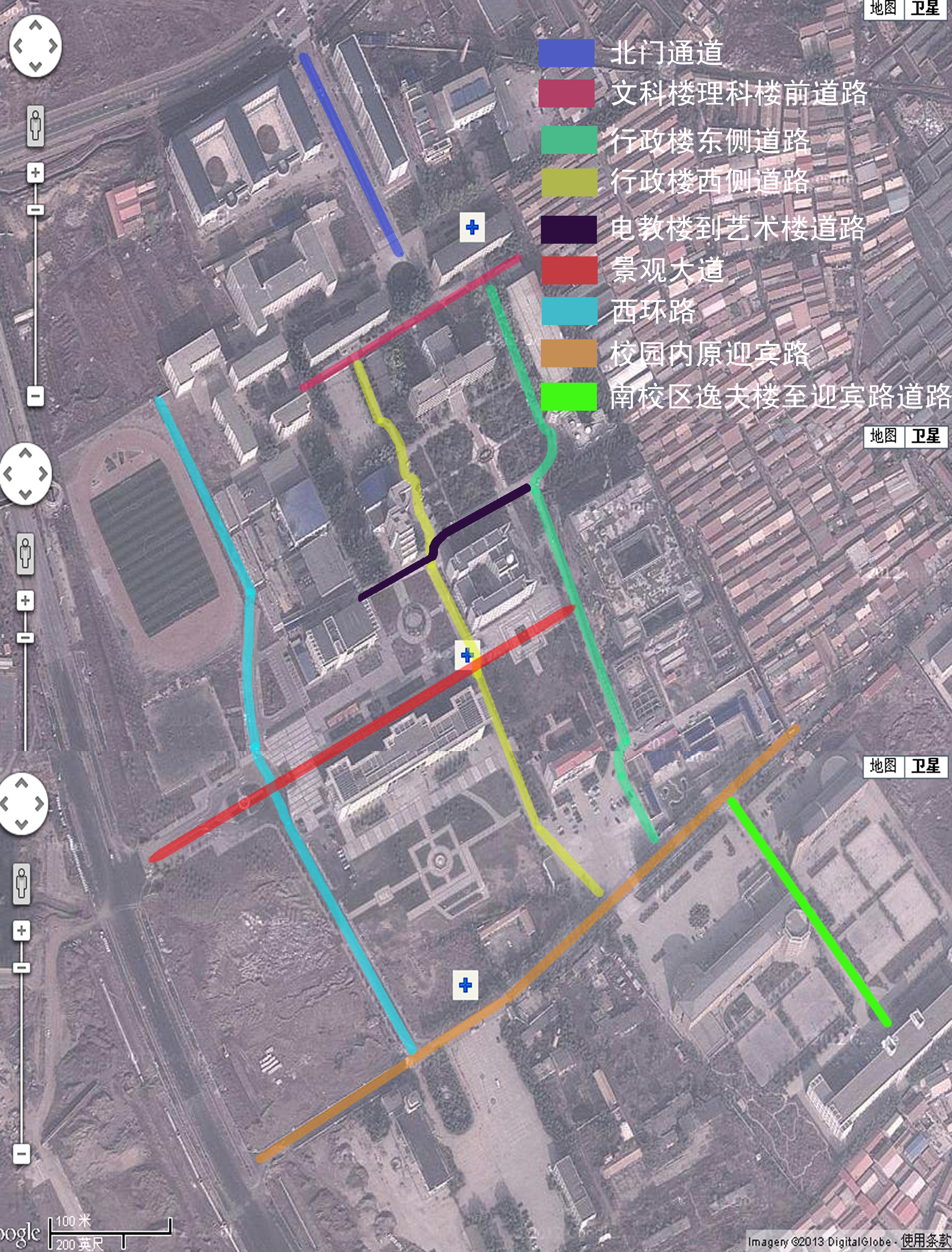 主要道路包括景观大道、校园内原迎宾路、北门通道、文科楼理科楼前道路、行政楼东西两侧道路、电教楼至艺术楼道路、南校区逸夫楼至迎宾路道路、西环路等(详见附件1校园地图道路标注)。同时,根据校园建设规划,对规划待建的道路名称也可命名(详见附件2校园规划平面图道路标注)。建筑物是指校园全部地上建筑物,包括办公楼、教学楼、文体场馆、学生公寓、食堂、新旧图书馆、学生服务楼等(详见附件3校园规划鸟瞰图楼宇标注)。
