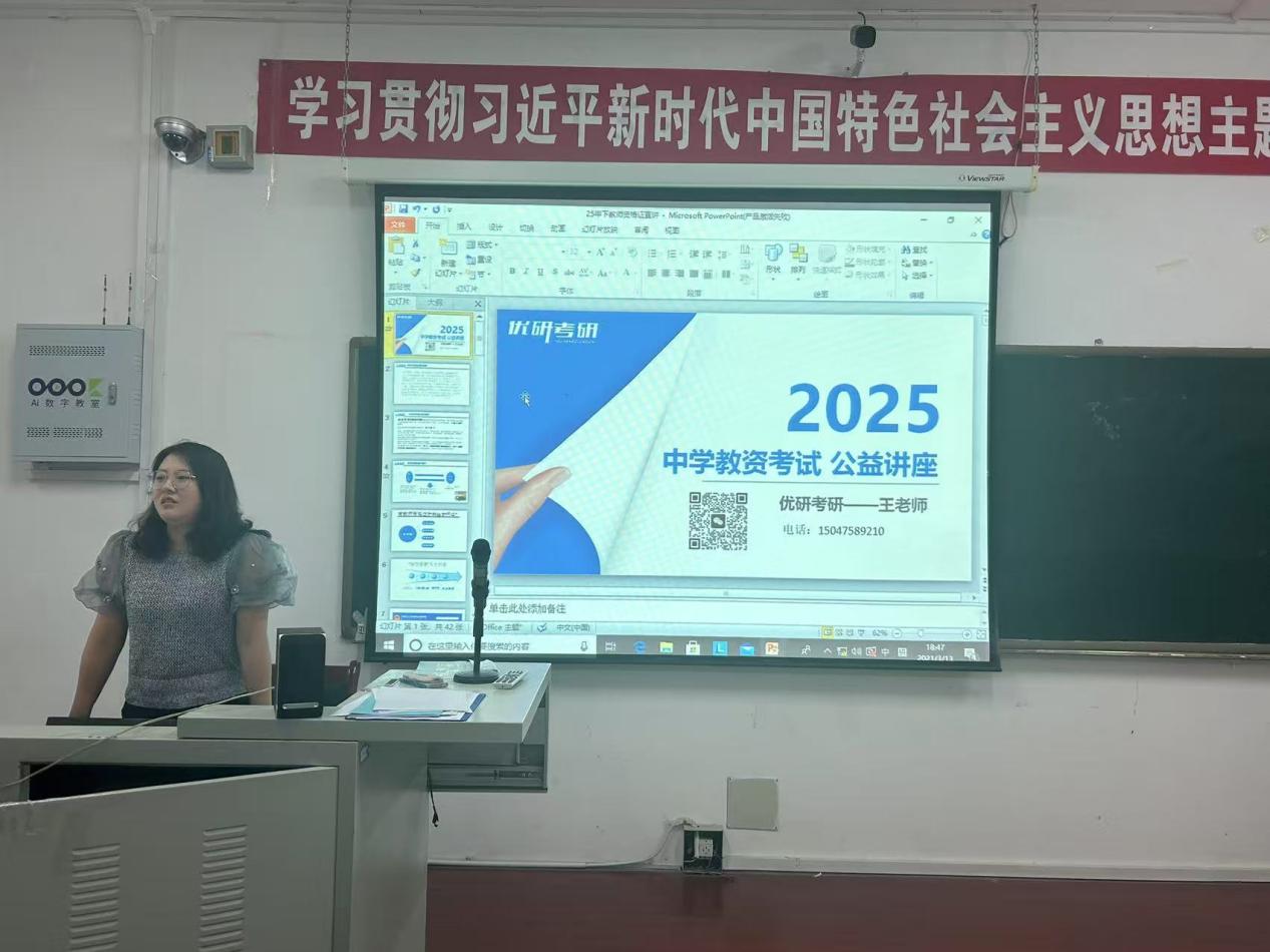 为强化我院学生对中学教资考试的认识、提升备考效率,我院于2025年6月23日开展了2025中学教资考试公益讲座,并邀请优研考研王老师为我院学生分享备考要点。