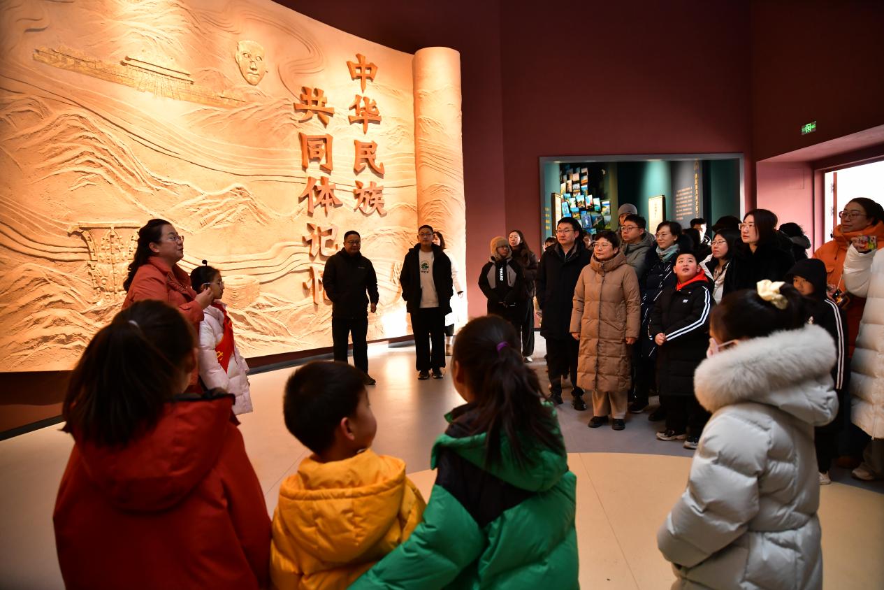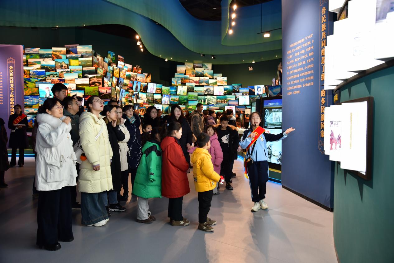 走进宣传教育基地,“红石榴”讲解员与“青马·石榴籽”志愿服务团队的同学们热情引导,医校双方人员共同在“党的民族工作百年大事记”“中华民族共同体记忆”等核心展区,文物图表、数字交互、场景复原等多元展陈形式,将中国共产党领导民族工作的百年历程具象化呈现。