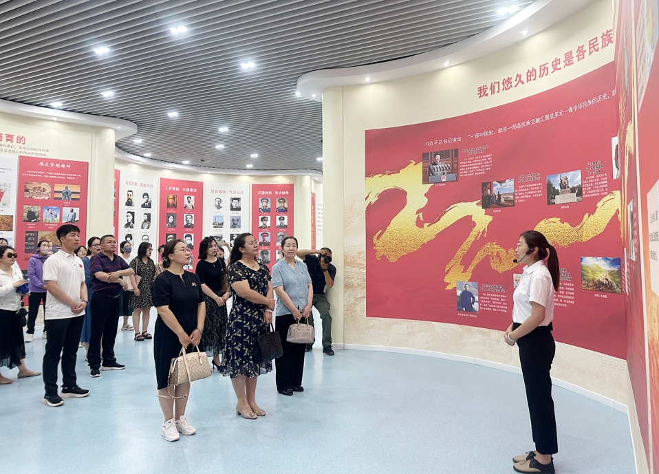 7月10日,党委统一战线工作部以“深入学习贯彻中央民族工作会议精神 铸牢中华民族共同体意识”为主题,在赤峰蒙古族中学开展了统战干部能力提升暑期教育实践活动。党委委员、党委统战部部长齐建萍,党委统一战线工作部全体成员,各二级单位统战委员代表和赤峰市铸牢中华民族共同体意识体验馆教师志愿讲解员代表参加活动。