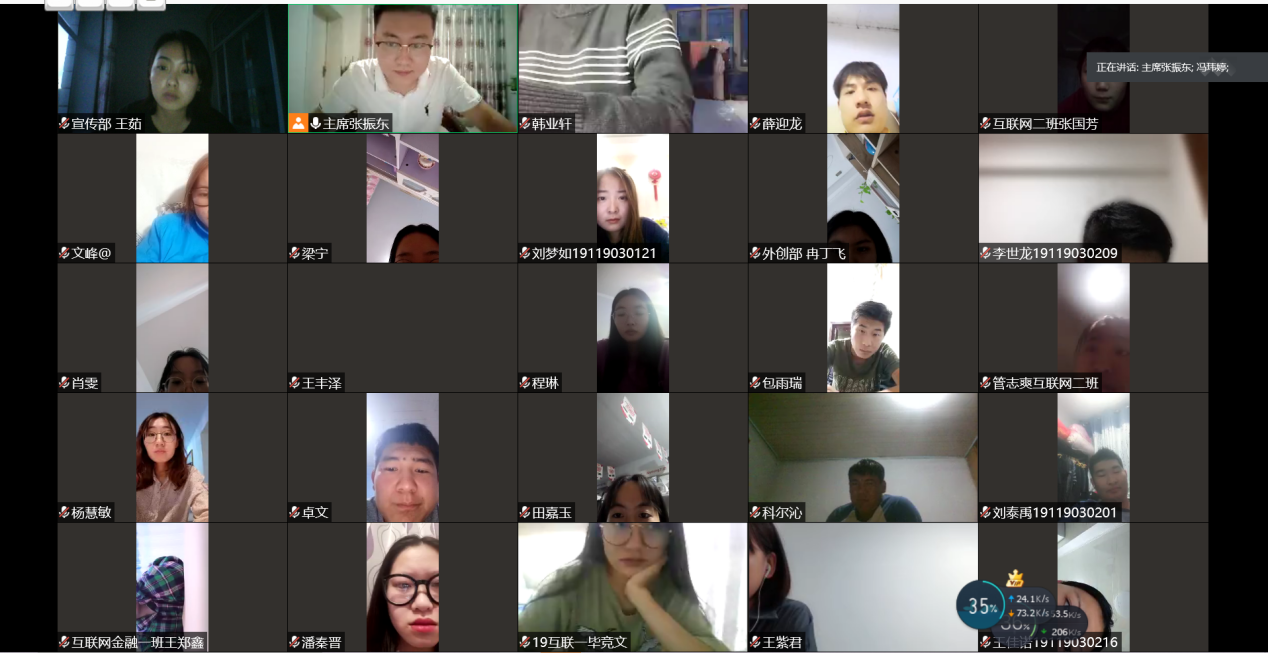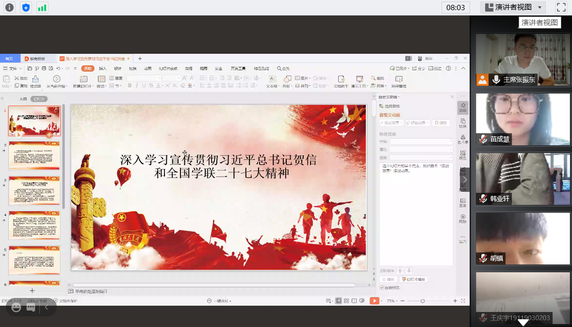 学生会成员分享了自己学习总书记贺信精神及大会工作报告的体会和感受,以抗疫工作及国际国内形势为切入点,谈了自己对本次大会召开的重要背景意义的认识。