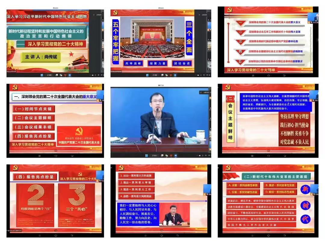 尚传斌老师采取现场直播的培训方式进行线上授课,培训课程首先全面回顾了党的十九大以来党和国家事业发展做出的重大战略部署以及我国在革命、建设、改革开放以及社会主义现代化建设新时期坚持从严管党治党的探索和实践成果,特别是党的十八大以来党和国家监督体系改革取得的历史性成果,同时围绕党的二十大的重大意义、过去五年工作和新时代十年的伟大变革、新时代新征程中国共产党的使命任务、全面建设社会主义现代化国家的战略部署等五个方面,以扎实的理论基础和通俗易懂的讲授方式,帮助老师和同学们深刻领悟党的二十大精神,将二十大精神融入进工作与学习中。