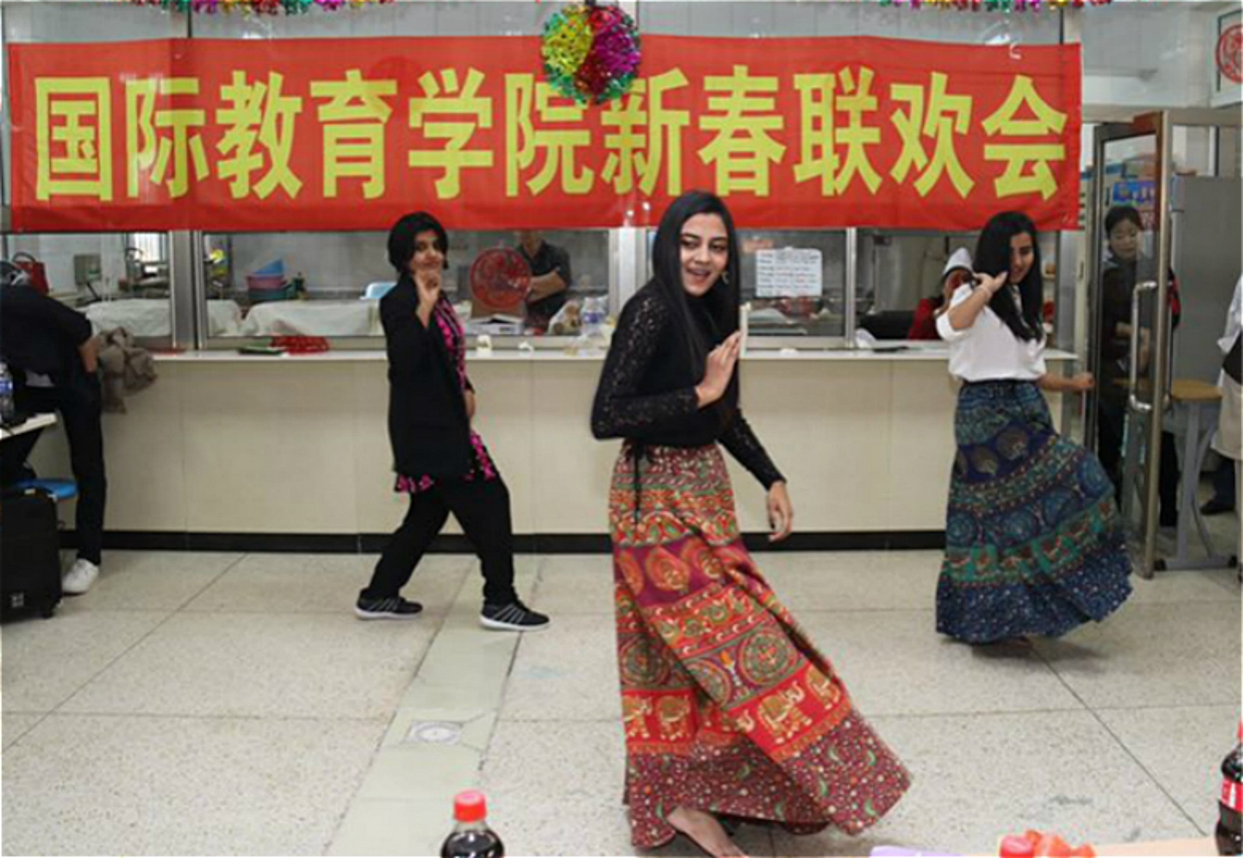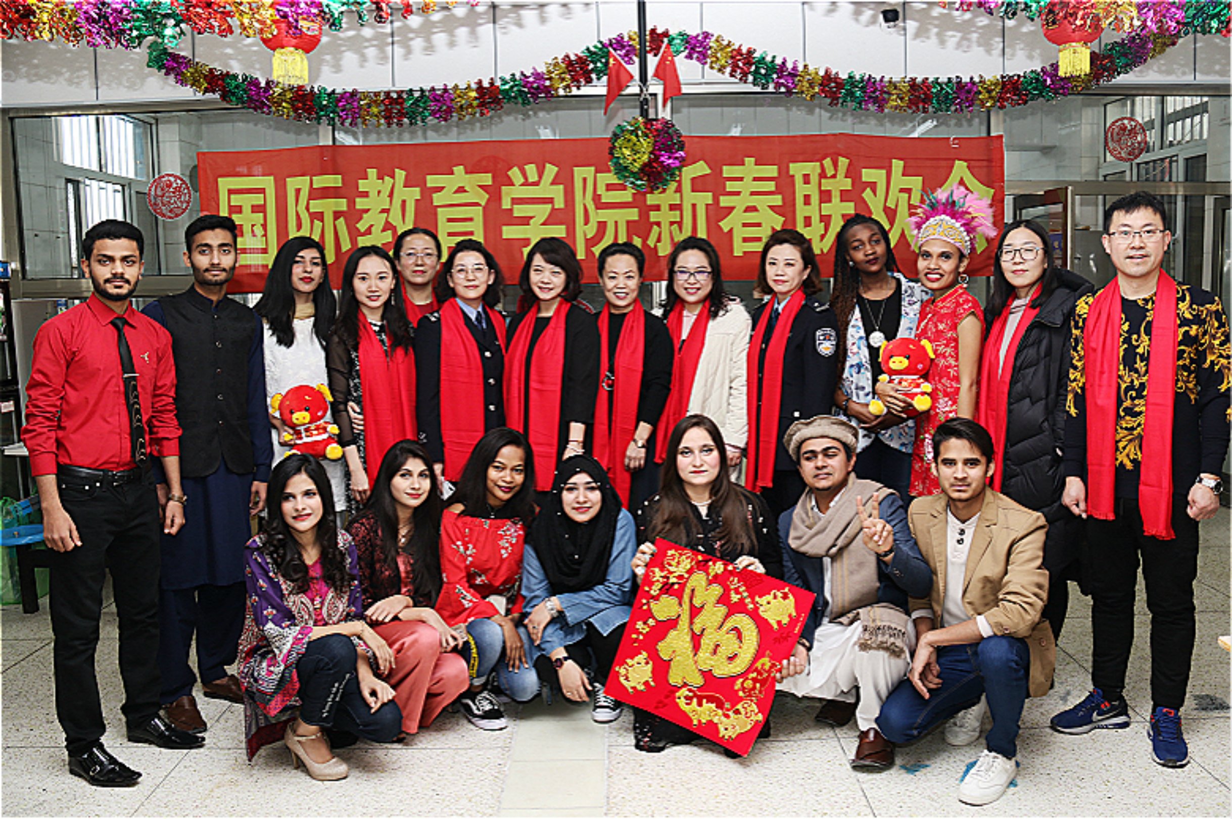 1月29日,我校餐厅内张灯结彩,处处洋溢着喜气祥和的“中国年”气氛。来自巴基斯坦、印度尼西亚、赞比亚、坦桑尼亚等国的近百名留学生和国际教育学院的老师们齐聚一堂,迎接己亥猪年新春的到来。赤峰市公安局出入境管理处、赤峰市公安局红山分局出入境管理大队以及红山区公安分局赤峰学院治安派出所的民警应邀参加了此次迎新春联欢活动。