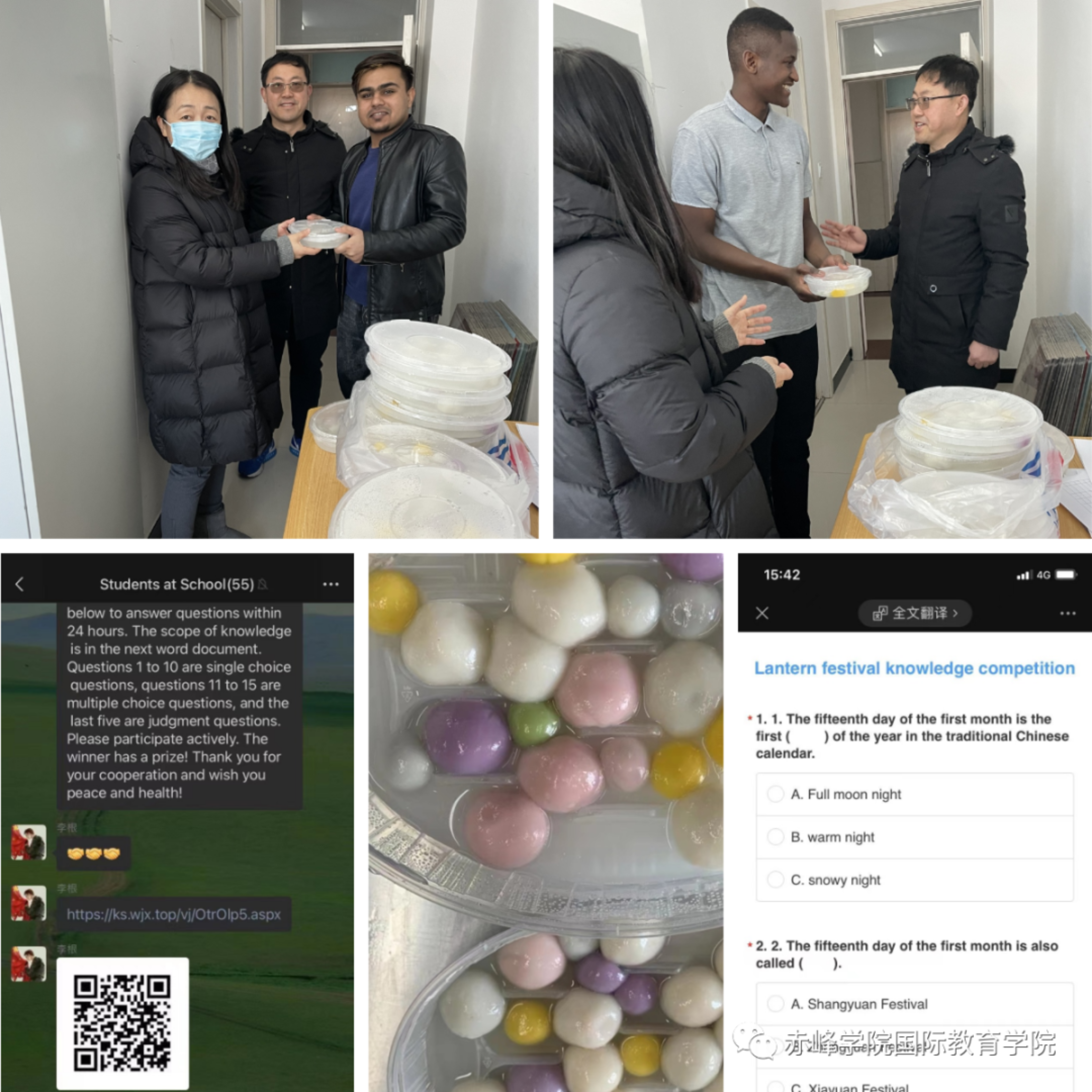 2月15日,元宵佳节,由于最新的疫情防控要求,我院师生没能像往年一样欢聚一堂,共同制作花灯,品尝汤圆。为了使留学生们感受“团圆”的温暖,国际教育学院院长葛根萨如拉、副院长任振涛,亲自为学生们送去了刚出锅的汤圆。除此之外,一场别开生面的“元宵节知识竞赛”在线上拉开,学生们积极热情地参与和出色地表现为元宵节画上了圆满的句号。