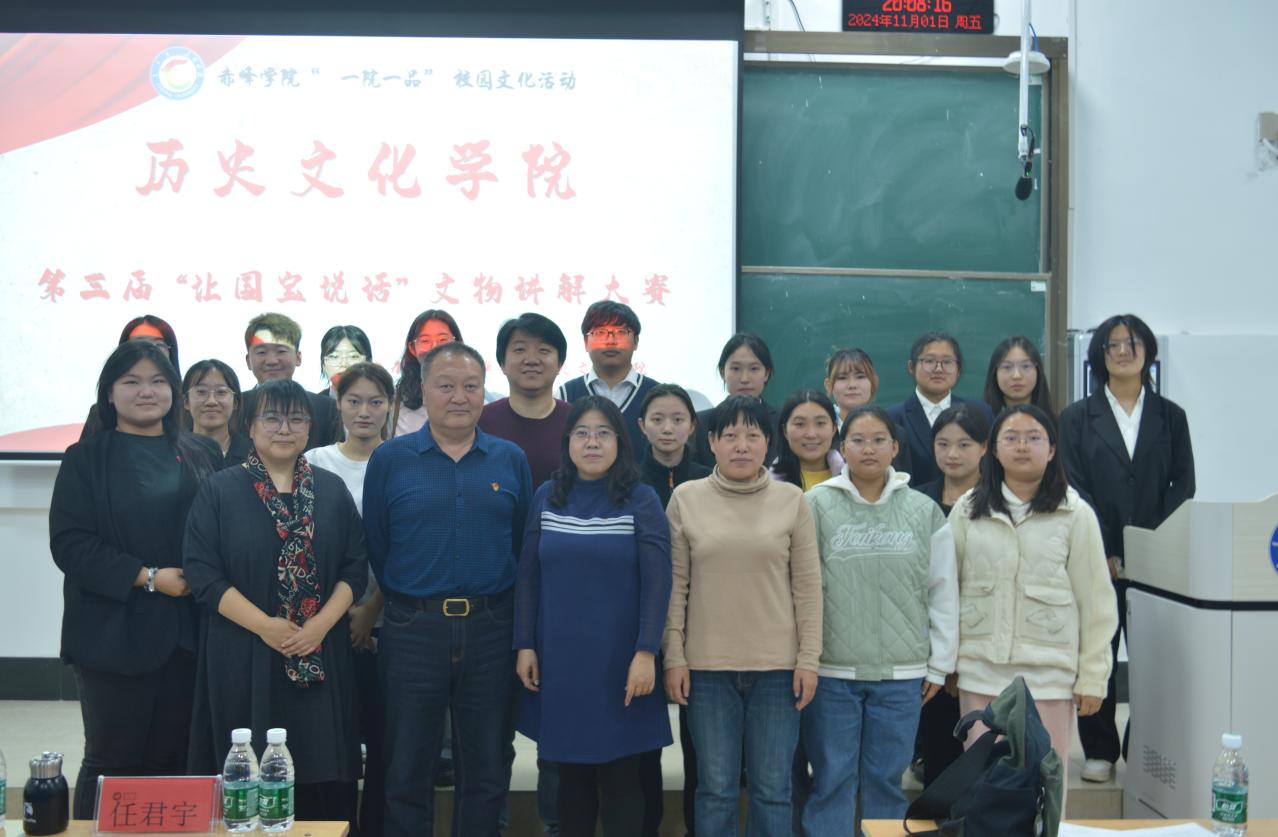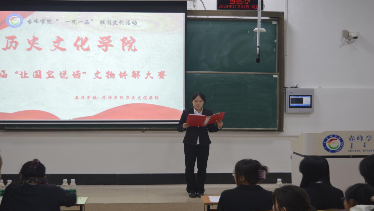2024年11月1日,赤峰学院历史文化学院举办了第三届文物讲解大赛。该活动由历史文化学院团总支主办,历史文化学院各专业本科生和专业硕士研究生参赛。历史文化学院党总支双喜副书记、历史文化学院副院长吕富华教授、历史文化学院实验中心主任任君宇老师、2024级文物保护技术班班导师张少珊老师和历史文化学院宋鸽老师担任评委与点评嘉宾。