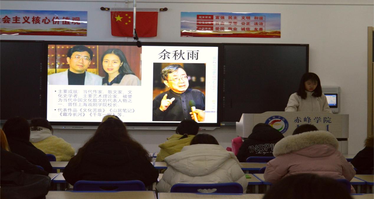“再小的个子,也能给沙漠留下长长的身影;再小的人物,也能让历史吐出长长的叹息。”这部书是余秋雨先生的首部散文集,书中借山水风物探索中国文化历史命运与文人墨客内在风骨,杨紫涵同学带领大家详细领会了作品中自然背景下的人文气息与历史背景下的审美心理,引起大家的热烈讨论。