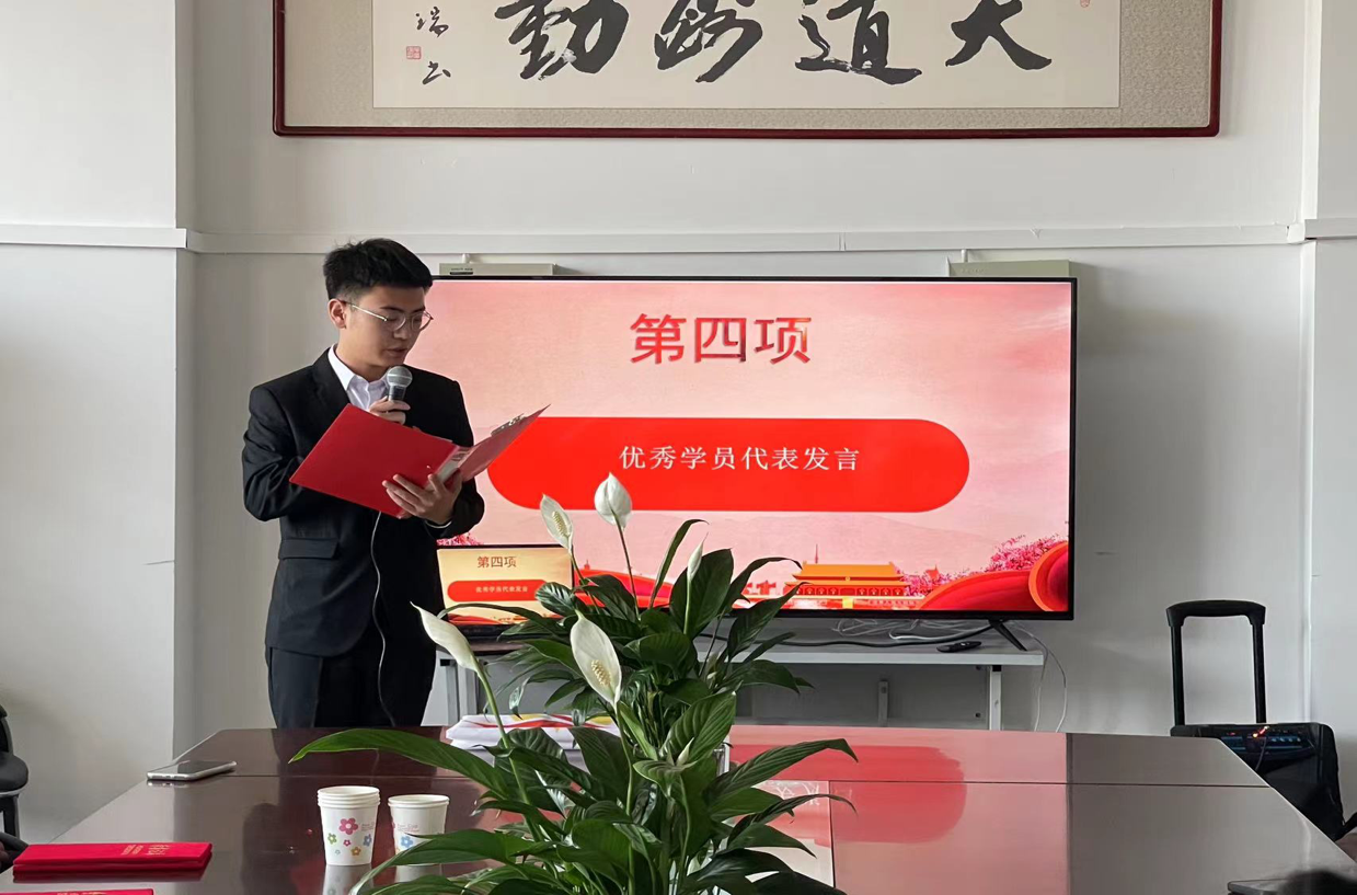 会议在奏唱中华人民共和国国歌中拉开序幕,会议分两个议程,分别是第二期青年马克思主义者培养理论研习班结业仪式和第三期青年马克思主义者培养理论研习班开班仪式。会上,马贞老师为第二期青马班优秀学员颁发证书。两期青马班学院代表交接青马旗帜。第二期优秀学员李昊泽代表青马班所有成员发言,能够加入青马班感到非常荣幸,研学期间学到了很多知识。第三期青马班学员代表高靖表示,加入第三期青马班一定会认真学习,要学有所获。最后,全体学员宣誓青马誓词,合唱团歌《光荣啊,中国共青团》,全体合影留念。
