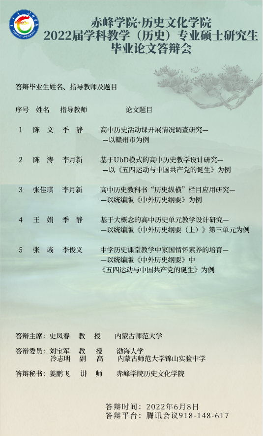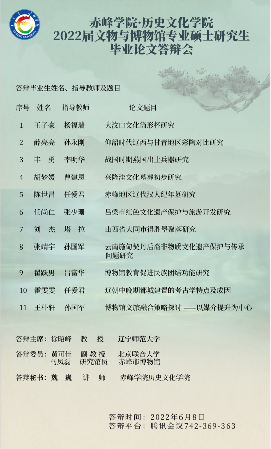 兹有赤峰学院历史文化学院2022届硕士研究生定于2022年6月8日进行学位论文答辩,共涉及两个专业:文物与博物馆、学科教学(历史),下为毕业生论文及答辩组专家信息。