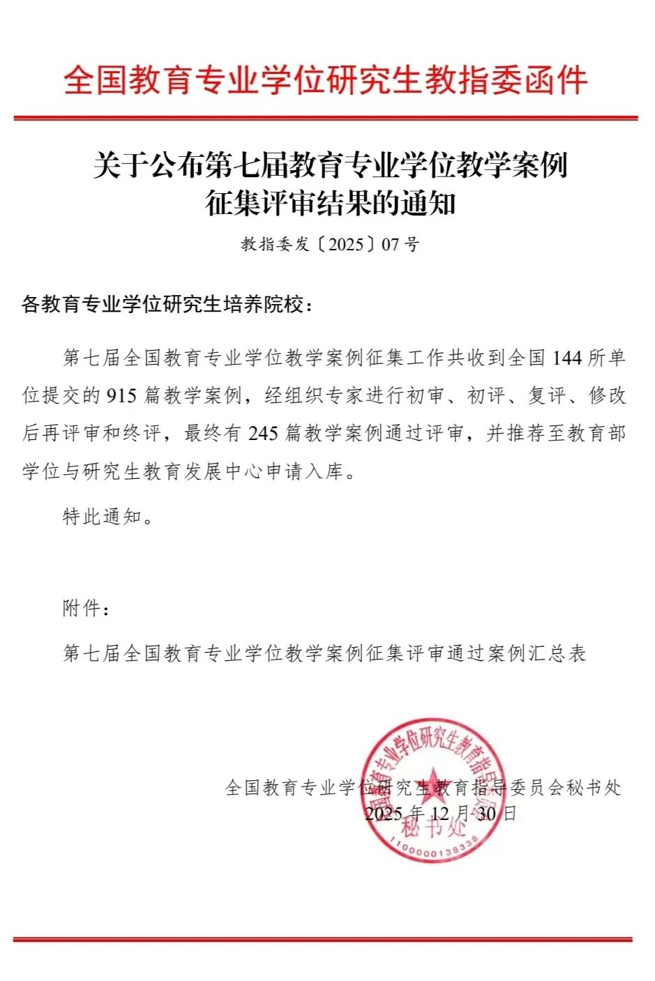 据悉,本次案例征集活动由全国教育专业学位研究生教育指导委员会组织开展,共收到来自全国144所单位的915篇教学案例。经过专家初审、初评、复评、修改后再审及终评等多轮严格遴选,共有245篇教学案例通过评审,被推荐至教育部学位与研究生教育发展中心申请入库。此次案例成功入库,是我院深化专业学位研究生教育改革、探索案例教学与人才培养模式创新的重要成果,充分彰显了学院教师将教育教学实践提炼为高水平教学案例的专业能力,对提升教育硕士培养质量、增强实践育人实效具有重要意义。