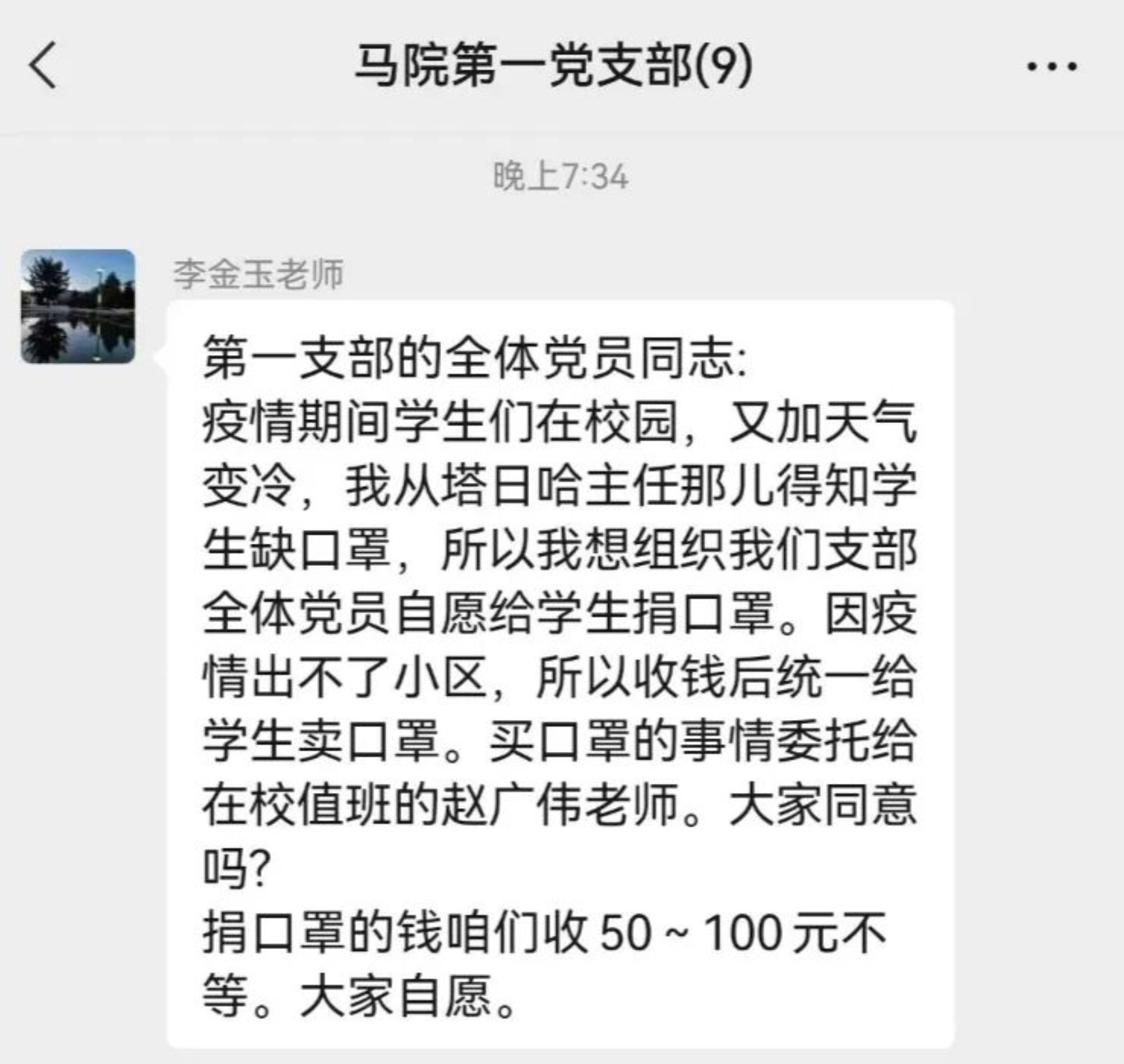 疫情无情,人间有爱。2022年10月11日,马克思主义学院第一党支部书记李金玉老师向支部全体党员发出爱心捐款倡议,为在校学生购买防疫物资。