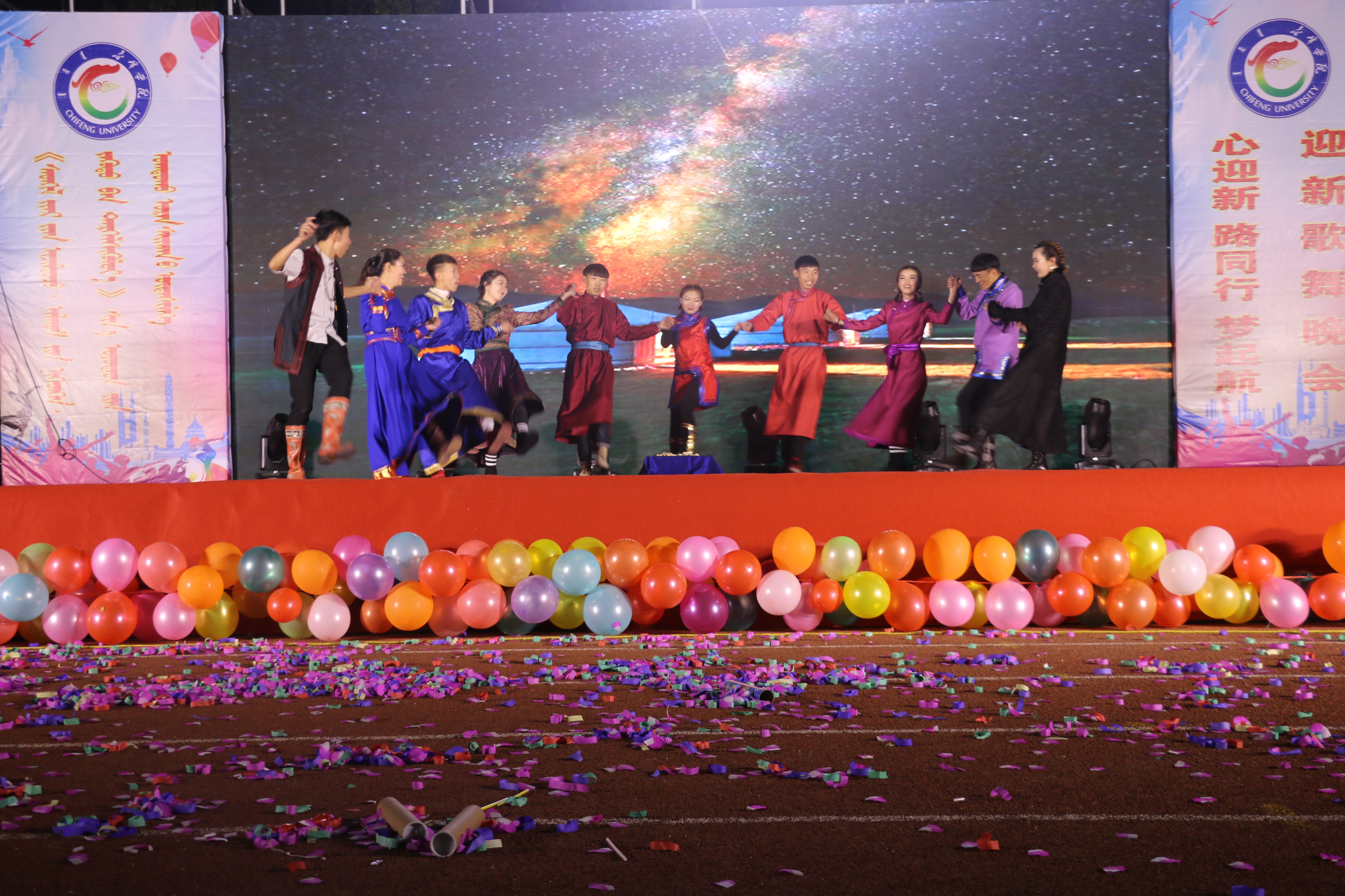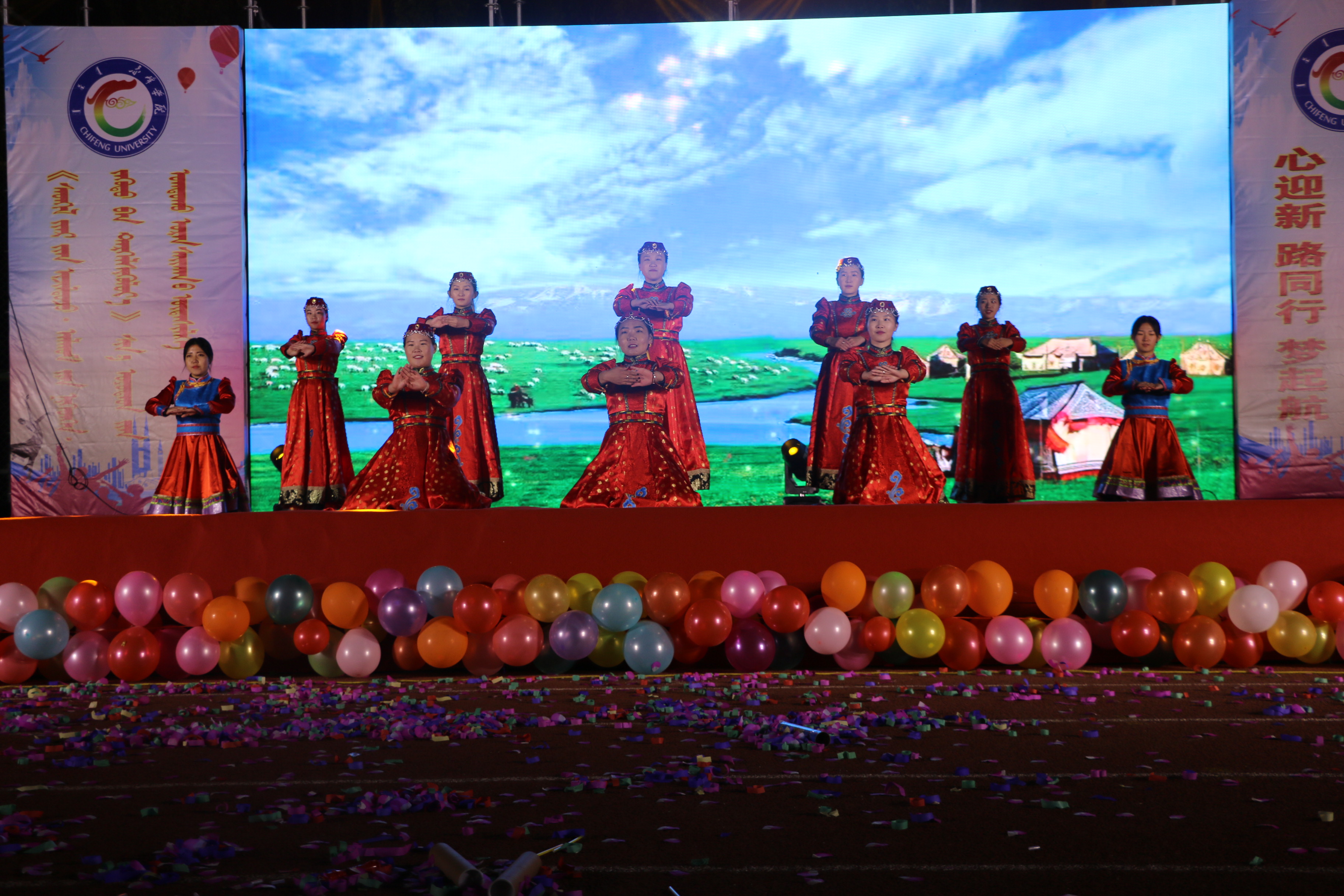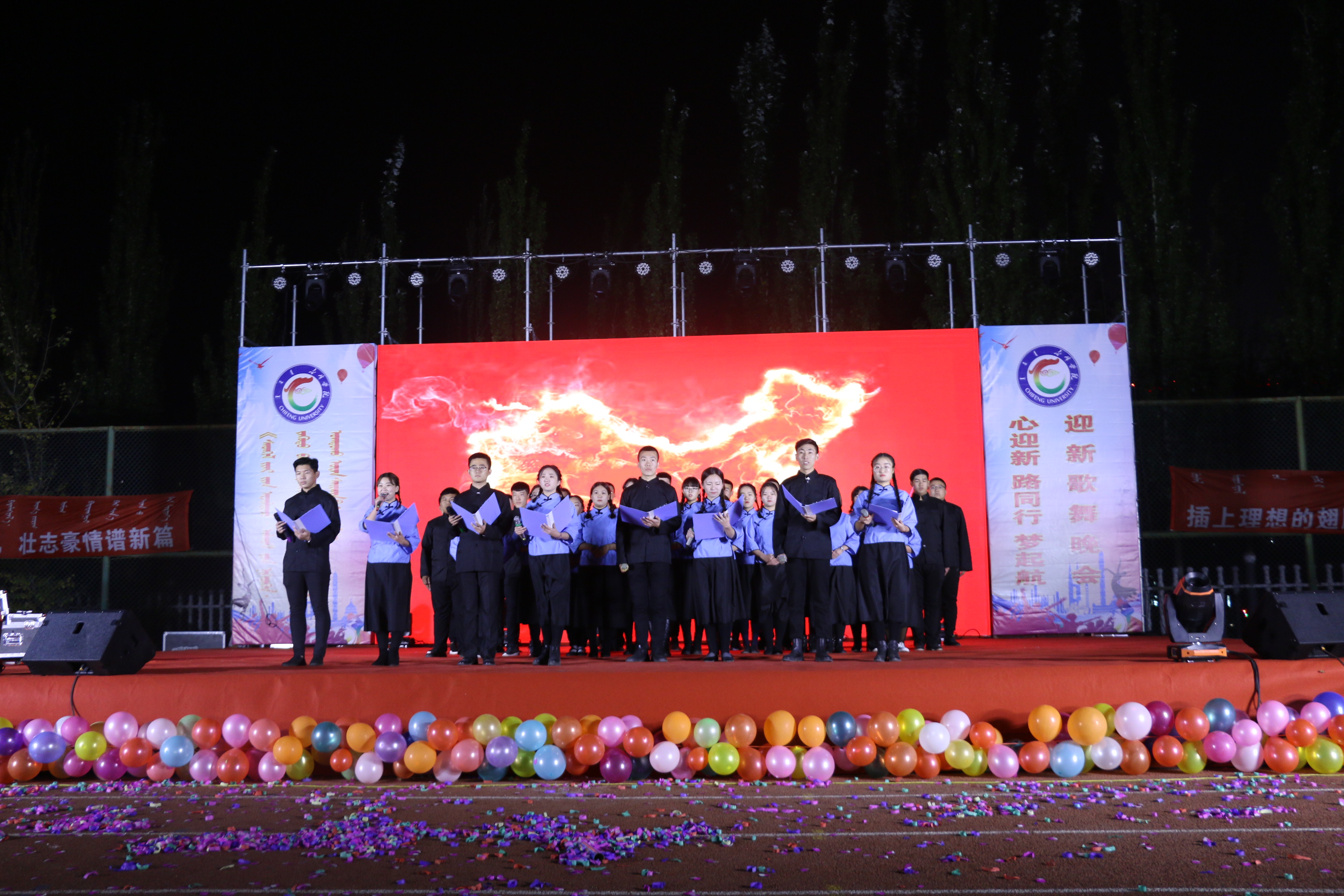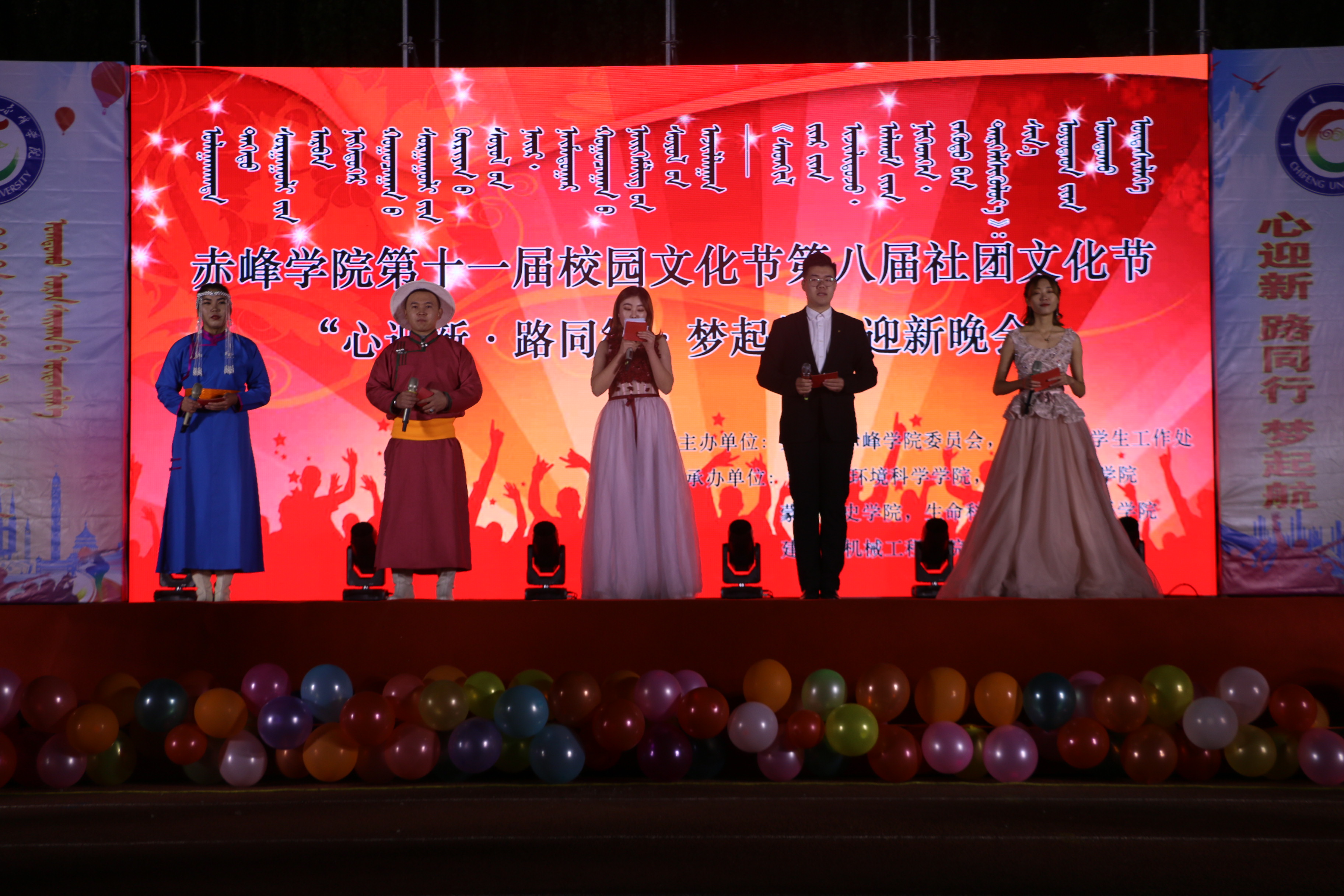 本着弘扬新时代大学生的精神风貌,丰富赤峰学院学生的课余时光。于10月13日晚,由共青团赤峰学院委员会和赤峰学院学生工作处主办;资源与环境科学学院、马克思主义学院、蒙古文史学院、数学与统计学院、建筑与机械工程学院、生命与科学学院和外国语学院联合承办的赤峰学院第十一届校园文化节第八届社团文化节之“心迎新·路同行·梦起航”七院联合迎新歌舞晚会在赤峰学院田径运动场隆重开幕。