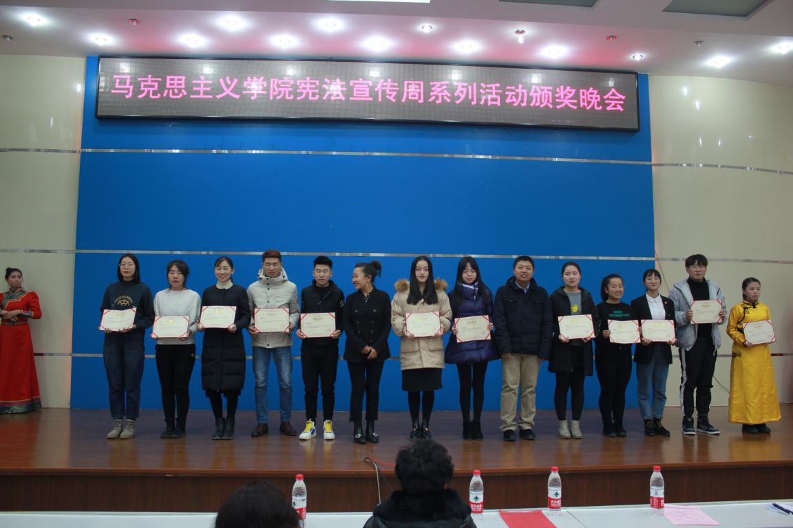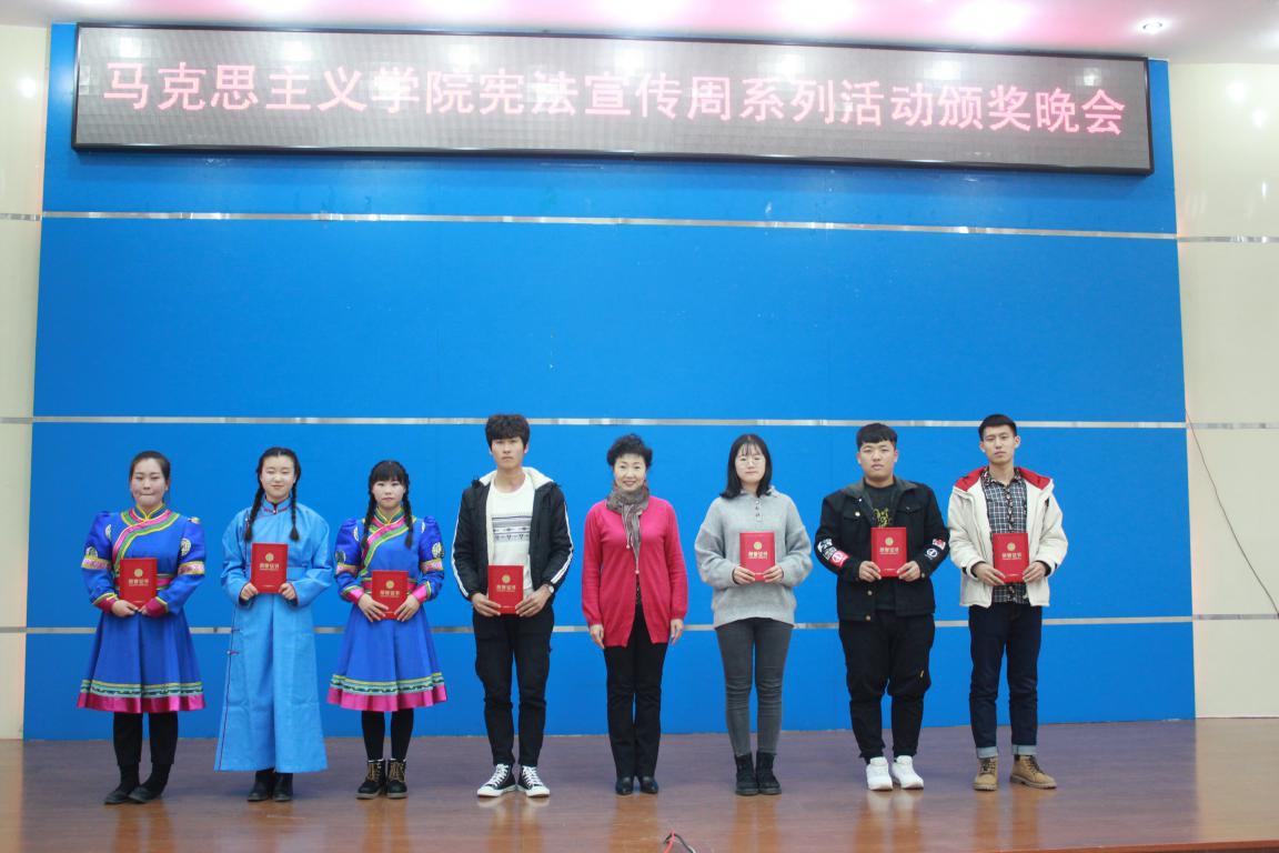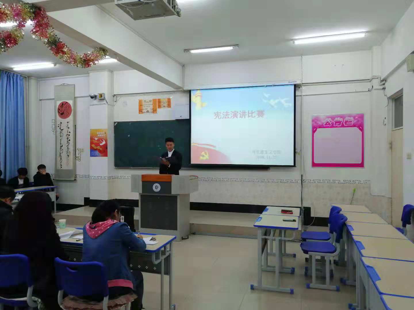 二、     举行宪法     演讲比赛     ——         弘扬宪法精神         照亮青春梦想                 11月23日下午在崇学楼206室举行         比赛评委         马克思主义学院副院长金向荣、马克思主义学院     教学副     院长吕东明、团总支书记斯琴塔日哈、创业就业办主任徐妍艳     组成     。参赛选手紧扣宪法主题,从法理、历史、现实等角度,阐述了对宪法权威性     ,用     声情并茂、抑扬顿挫的演讲表达了     他们     树立宪法意识,培育宪法精神,建设法治中国的心声。