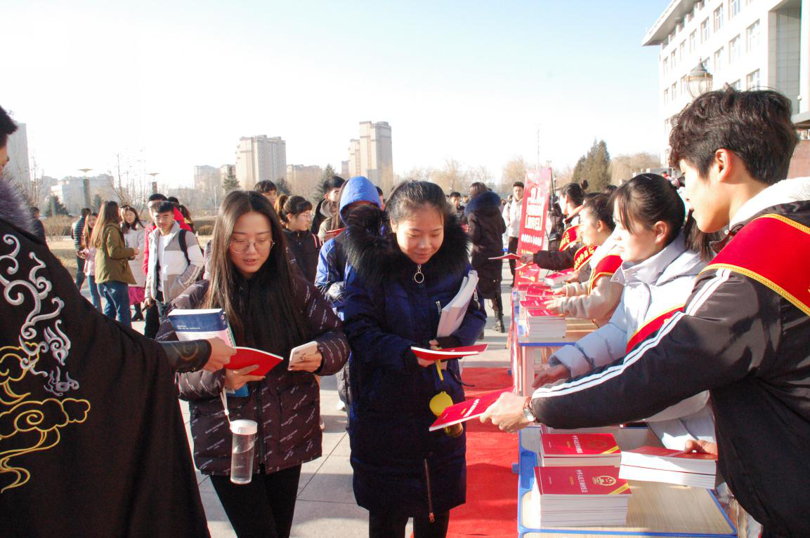 四、           发放宪法宣传手册——新时代 新征程 宪法与你同行                               12月4日上午,在崇学楼前布置发放点发放《宪法》宣传册。活动现场布置了内容丰富的法律知识宣传海报,吸引了不少同学的目光。一册又一册的宪法手册从工作人员的手中发出去,不到一个小时的时间发放了2000余本手册,很多老师、同学走在校园内,手中都捧着庄严神圣的宪法手册,为校园营造了浓厚的宪法日氛围,进一步推进了校园法治氛围的建设,让宪法走进校园、走入心灵。