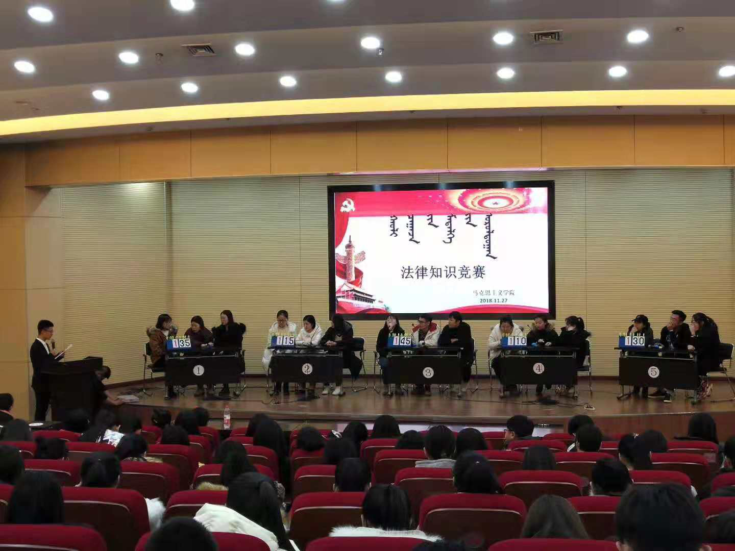 三、        开展“        法律知识竞赛        ”活动                      11月27日下午,在博物馆二楼学术报告厅举办了法律知识竞赛。这次竞赛的主要目的是提高我校        学生        的法律知识水平,培养法制精神,宣传法律知识,并促进学风建设,丰富课余生活,提供展示                舞台。        本次比赛        分为蒙语组和汉语组进行比赛,共有13支队伍参赛                题目内容涵盖了        《宪法》、        《民法》、《刑法》、《行政法》        、《经济法》        等,考察了同学们对法律知识的掌握程度,引导同学们善用法律武器保护自己的切身利益                努力为“法治中国”添砖加瓦。整场活动在紧张而欢快的氛围中进行,寓学于乐,参赛选手和观众收获了        喜悦、收获了        知识