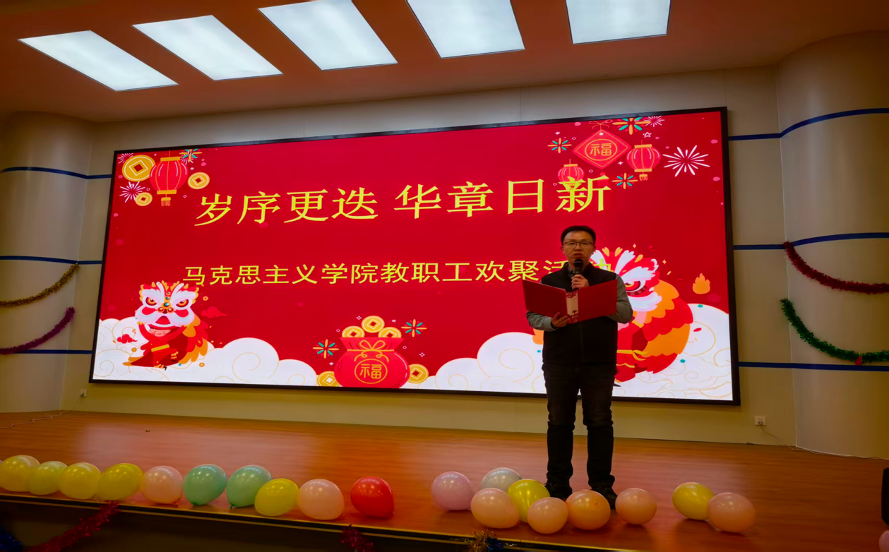 冬意渐浓情更暖,辞旧迎新乐满堂。2025年12月26日,马克思主义学院于崇仁楼五楼智慧思政教室举办元旦教职工联欢活动,全院教职工欢聚一堂,在温馨欢乐的氛围中迎接2026年的到来。活动开始前,马克思主义学院党总支副书记宁德安代表学院向全体教职工致以亲切问候和节日祝福,并希望通过活动进一步增进同事情谊、凝聚集体力量。现场洋溢着浓浓的节日氛围与集体温情。