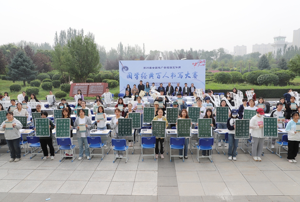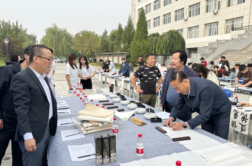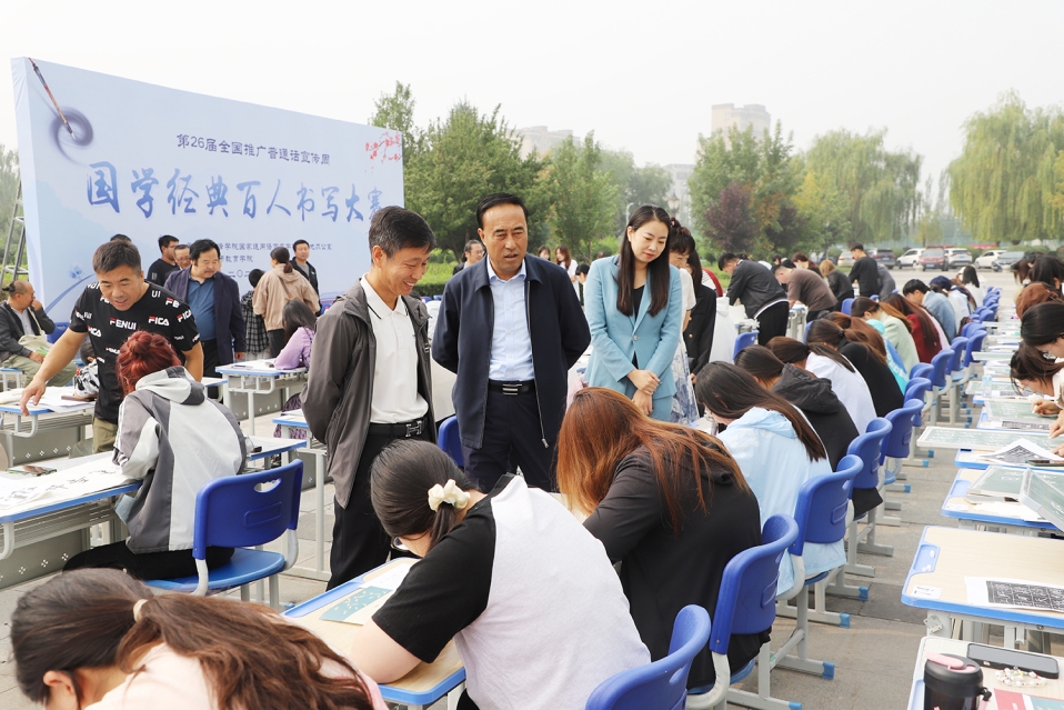9月17日上午,由我校国家通用语言文字推广基地主办、教师教育学院承办的“国学经典百人书写大赛”在崇学楼前举行。校党委委员、副校长徐振军,教务处、教师教育学院、美术学院等单位负责同志、教师代表在现场观看比赛。来自22个二级学院的130余名书法爱好者参加比赛。