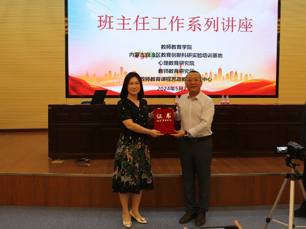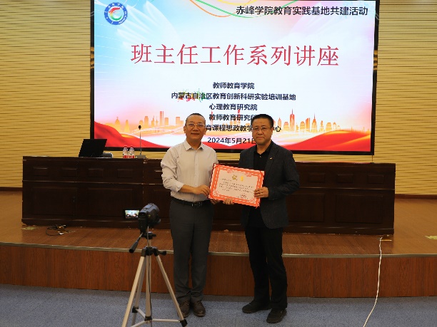 讲座结束后,教师教育学院杨晓坡院长对两位老师对我校教育实习活动的支持表示感谢,并为两位老师颁发了证书。杨院长表示,赤峰学院教育实践基地的建设离不开实习基地校的支持,班主任工作作为教育实习的重要组成部分,对实习生来说相对抽象且繁杂,本次系列讲座带领我校实习生从实践角度全面认识教育管理工作,将为他们后续教育实习工作提供有益指导。