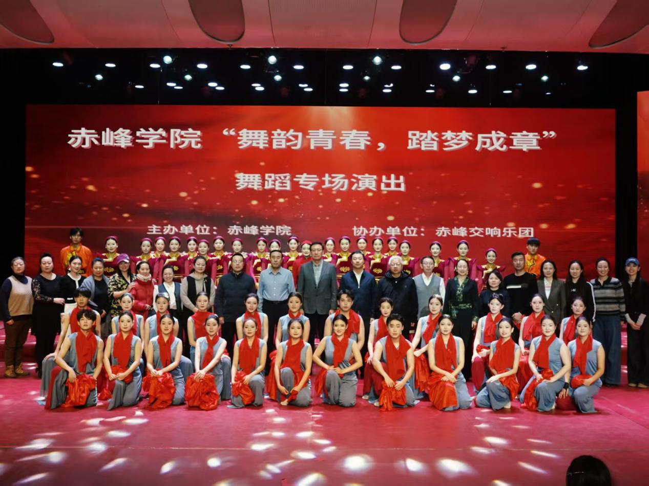 2025年12月27日,赤峰学院音乐学院“舞韵青春 踏梦成章”舞蹈专场演出在赤峰市达丽雅剧场圆满落幕。学校党委书记孟和巴特尔,党委副书记李伟威,党委委员、副校长徐振军,党委委员、纪委书记阿云嘎,党委委员、统战部部长齐建萍,音乐学院领导班子全体成员与现场观众共同观看演出,见证音乐学院2022级、2023级、2024级舞蹈班学子带来的艺术盛宴。