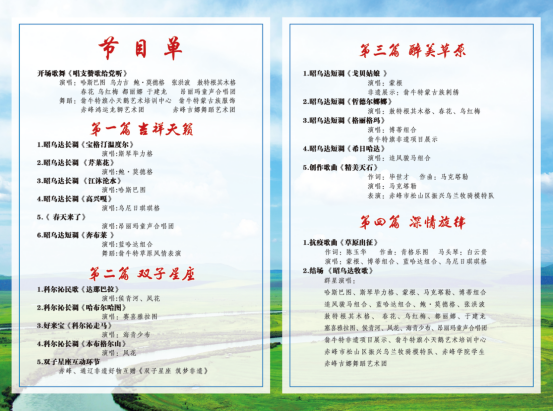 本次非遗专场演出以深入推进“两个打造”工程,铸牢中华民族共同体意识、树立和突出中华文化符号和中华民族形象为主线,共分为《吉祥天籁》《双子星座》《醉美草原》《深情旋律》四个篇章。赤峰本土及通辽市的非遗代表性传承人、专业歌手、乌兰牧骑演员携手合作、凝心聚力,以原生态民歌丰富的艺术表现形式,谱写新时代华彩乐章。