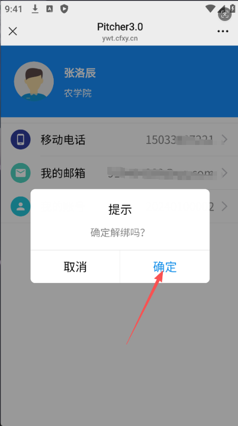 3、点击“我的账号”按钮->弹出解绑页面,点击“确定”按钮,解绑成功