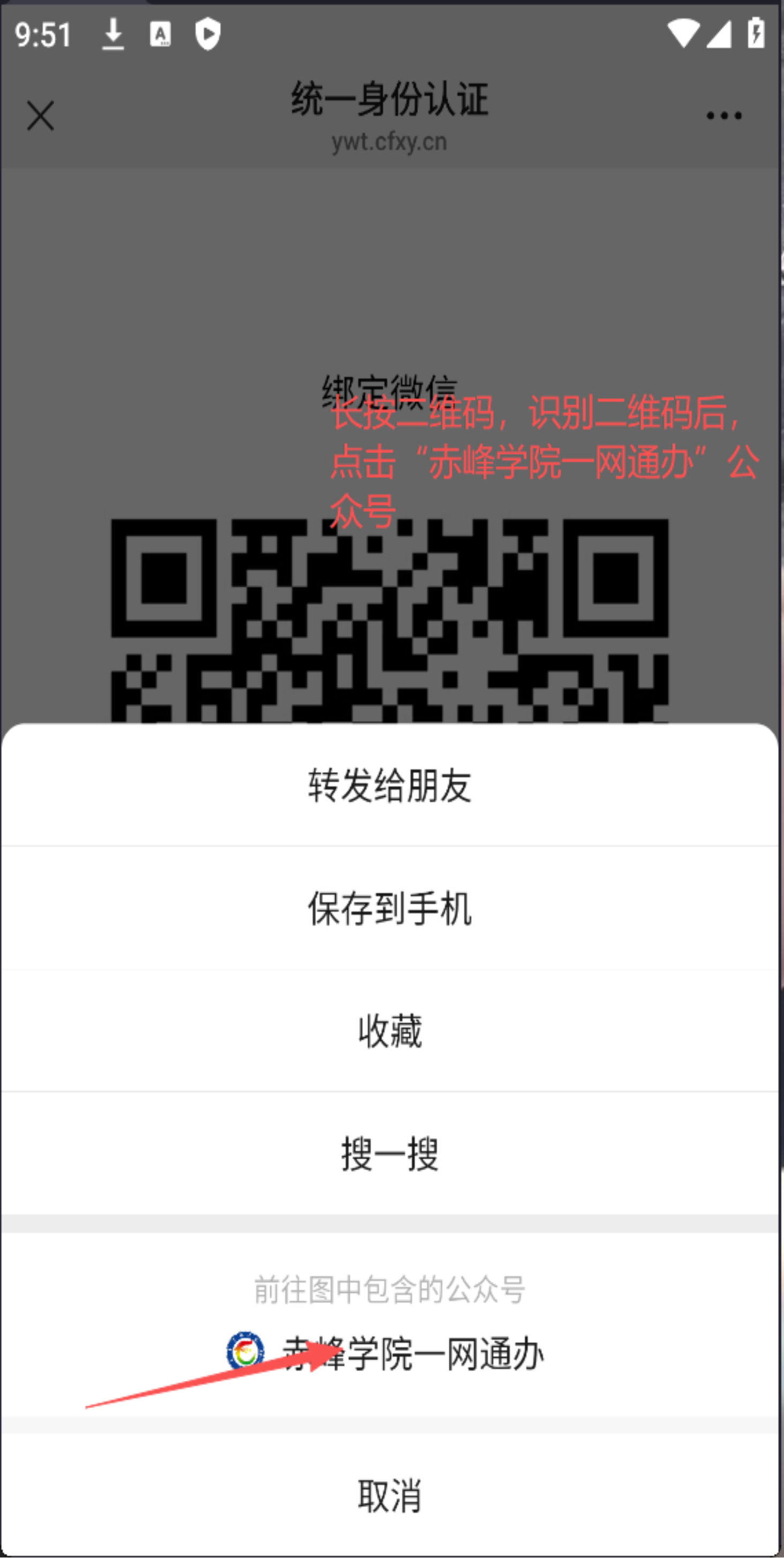 5、点击“去绑定”按钮,进入绑定微信界面->长按识别二维码->点击下方的前往图片包含的公众号,点击“赤峰学院一网通办”公众号->公众号提示绑定成功学号即可