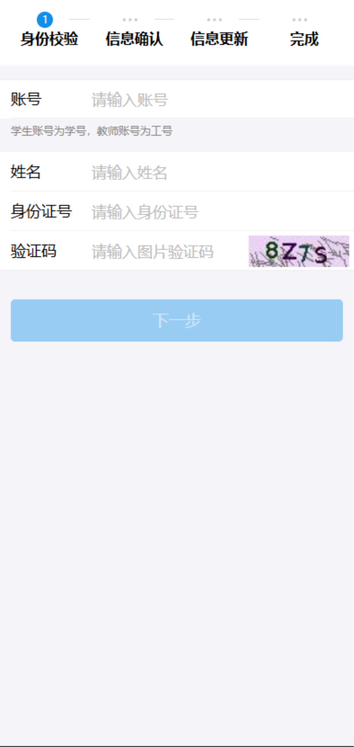 6、如果输入学号或者手机号提示“账号不存在或未绑定手机号”,在登录界面的下方点击“更换手机号”按钮,进入信息验证维护界面->填写账号、姓名、身份证号、验证码等信息->点击下一步,进入信息确认界面