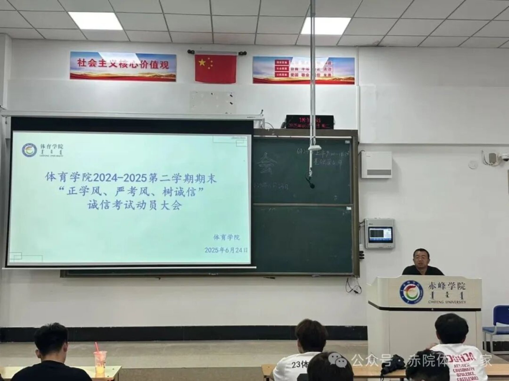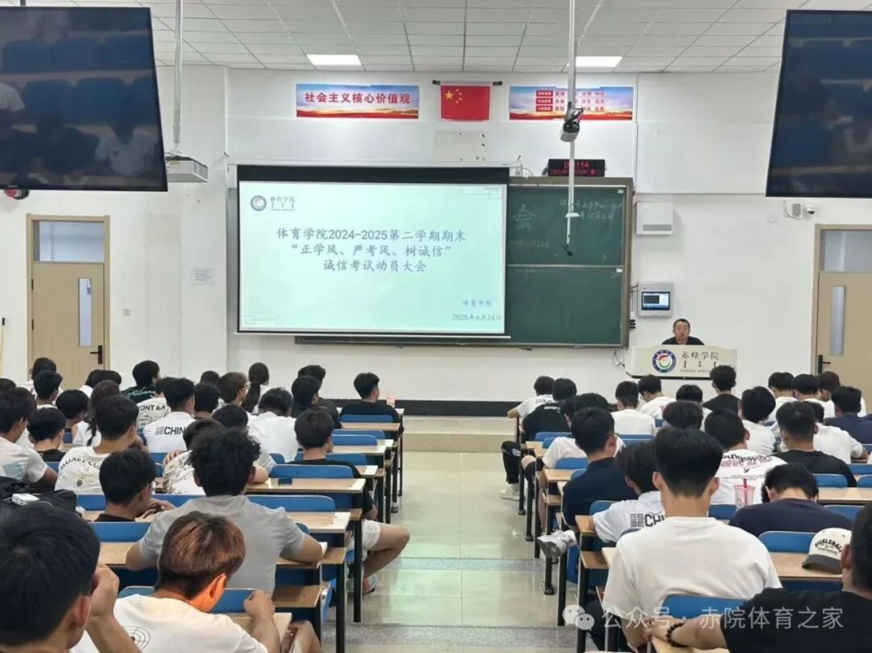 为进一步加强考风考纪建设,强化学生诚信考试意识,营造良好的考试氛围,6月24日晚六点,赤峰学院体育学院在综合楼101召开2024–2025学年第二学期期末“正学风,严考风,树诚信”诚信考试动员大会。本次大会由团学办主任米宏伟主持,全体大一大二同学参加。