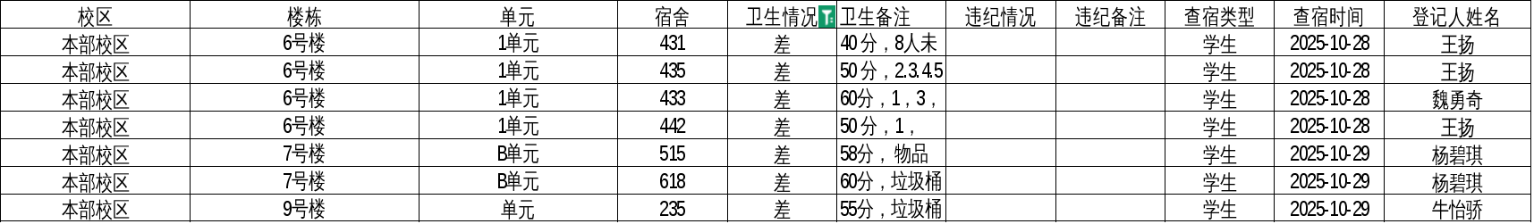 本周抽查男女生宿舍共计43间,其中卫生情况为差(即60分及以下)的宿舍有如下7间,现予以公示: