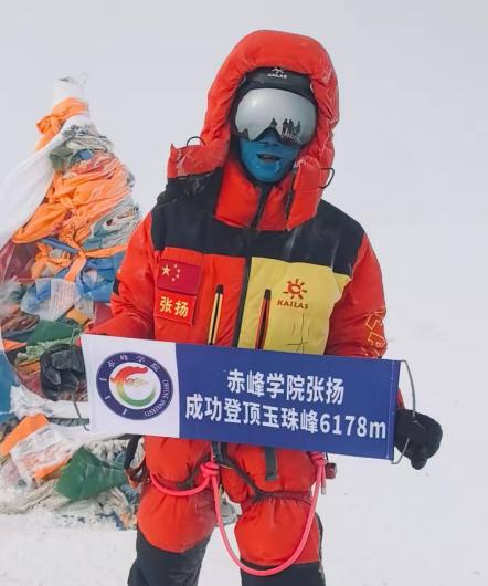 54日,赤峰学院音乐学院张扬同学成功登顶玉珠峰6178米,手持蓝色牌子记录下这一辉煌时刻。这不仅是个人成就的体现,更是对五四精神的深刻践行。