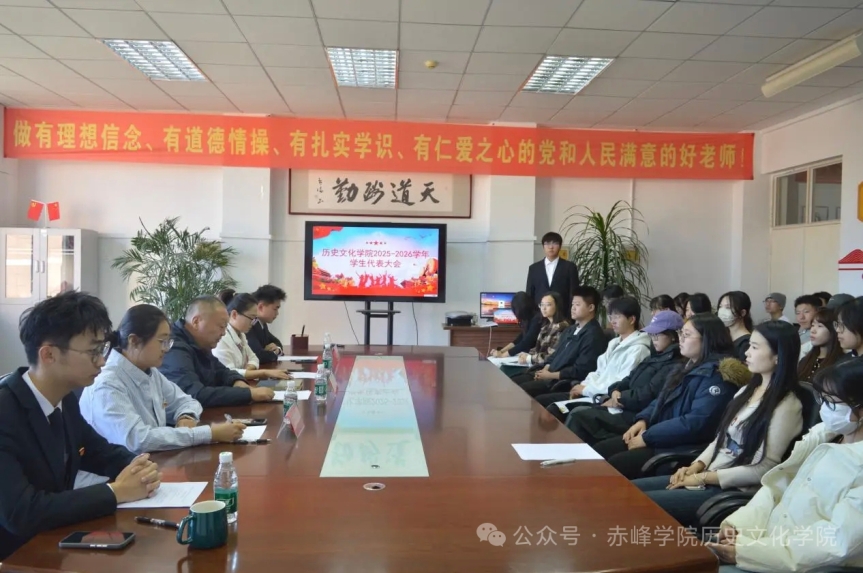 2025年11月16日上午九点,赤峰学院历史文化学院在崇仁楼429室召开学生代表大会,党总支副书记双喜、团总支书记季林林等参与,审议报告并选举新一届学生会主席团,大会圆满落幕。