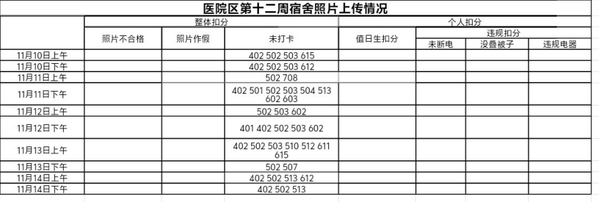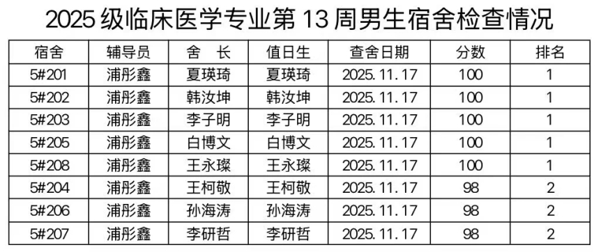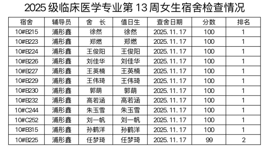2025年11月17日,临床医学院公示2025-2026学年第一学期第十三周校本部学生宿舍安全及内务检查结果。此次检查由临床医学院学生会及各组织开展,涉及2023级、2024级、2025级学生宿舍,公布了各宿舍分数、排名及优秀宿舍展示,同时指出部分宿舍存在插排未断电、物品摆放不整齐等问题。