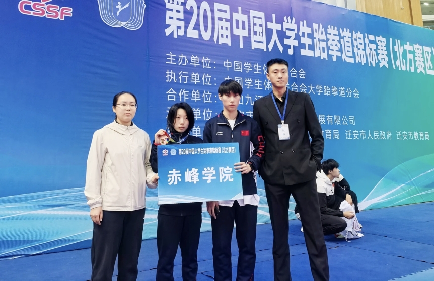 2025年11月,赤峰学院参加全国大学生跆拳道锦标赛(北方赛区),首次组队参赛便斩获佳绩,王璐获女子甲组44kg级季军,莫文博获男子甲组58kg级第五名,由郭晓光院长担任领队,王镭、杨珊珊老师任教练,赛事填补学校项目空白。
