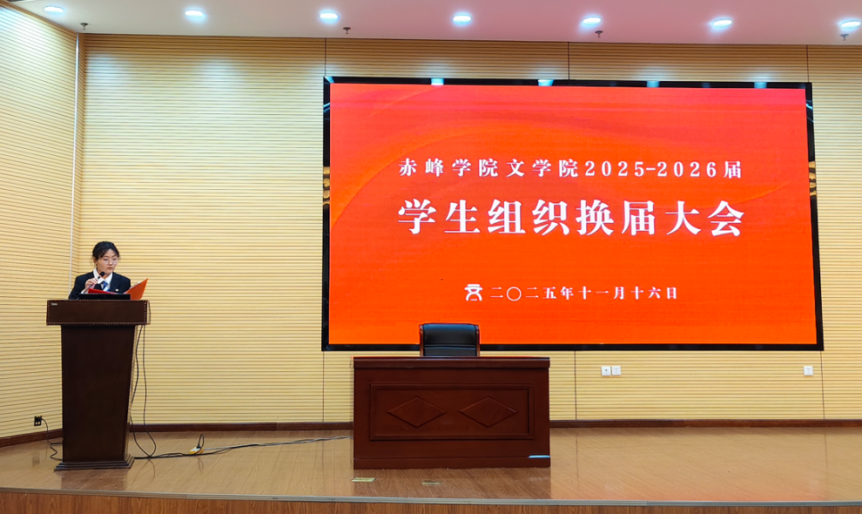 2025年11月16日,赤峰学院文学院在学术报告厅召开学生组织换届大会。党总支副书记孙宁、团总支书记隋春艳等出席,90名学生代表参会。大会表彰优秀学生骨干,杨舒贺作学生会年度工作报告,20名候选人竞选演讲后进行无记名投票。此次大会为学生组织注入新活力,助力文学院发展。