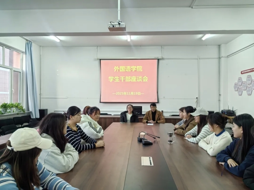 2025年11月19日下午,赤峰学院外国语学院在崇仁楼332召开学生干部座谈会,党总支副书记赵阳、团学办副主任毛文奇及全体学生干部参会,会上各部门汇报工作,老师点评并提建议,赵阳强调学生干部工作要提质增效。
