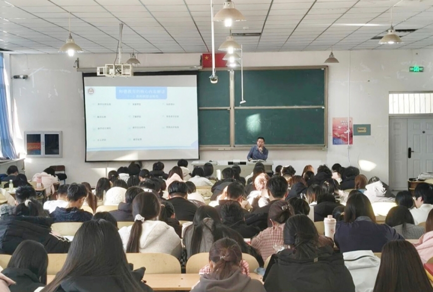 2025年11月19日下午,赤峰学院崇实楼实验二教室,化学与生命科学学院举办专题讲座,松山区教育教学研究中心王学刚老师主讲,副院长赵丽敏主持,部分教师及180余名本、研学生聆听。讲座解读师德内涵,分享教师学习平台,为师范生指明素养提升方向。