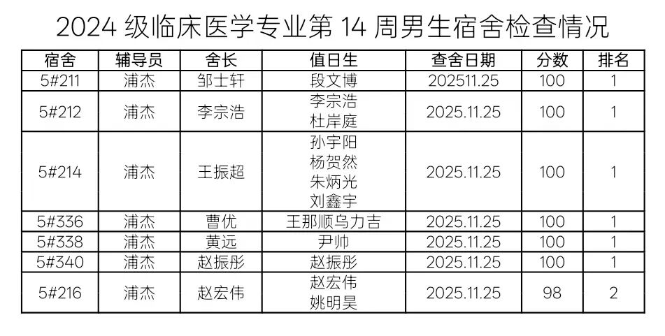 临床医学院学生会及各组织于第14周对2023级、2024级、2025级学生宿舍进行了安全排查和内务检查,现将结果公示如下: