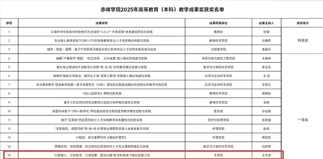 2025年11月,赤峰学院2025年高等教育教学成果奖揭晓,文学院两项成果获奖:王文津主持的“融创话剧工坊”获本科教育一等奖,创新“学创演”一体化育人;李景梅主持的“四维融合”模式获研究生教育二等奖,强化教育硕士实战能力。本次获奖彰显了学院教学改革成效,为学校高质量发展贡献更多力量。