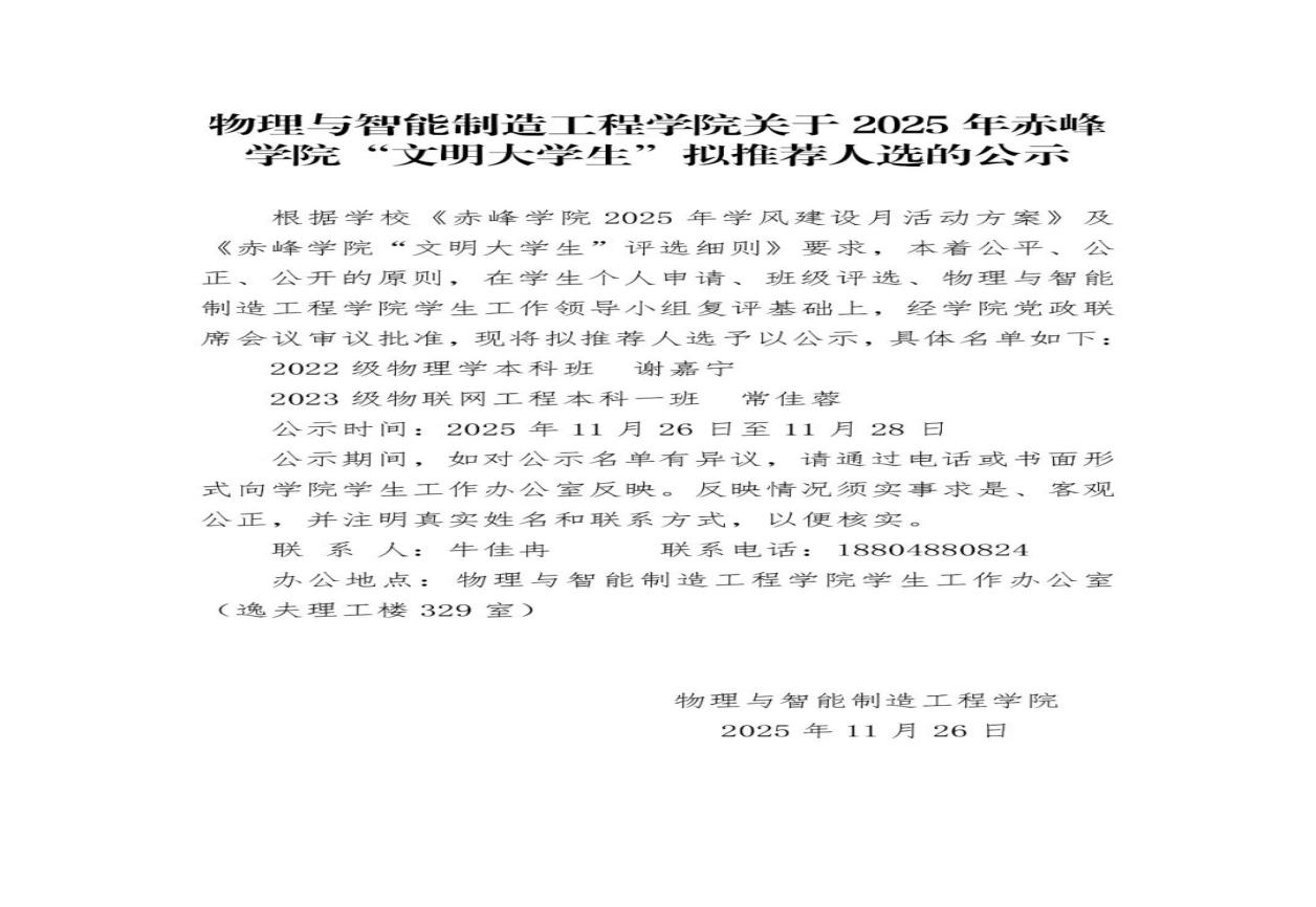 物理与智能制造工程学院关于2025年赤峰学院“文明大学生”拟推荐人选的公示