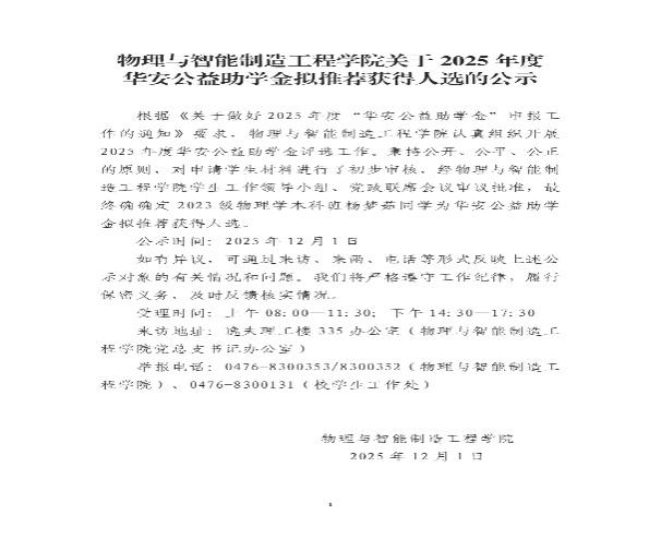 12月1日,物理与智能制造工程学院公示2023级华安公益助学金拟推荐人选