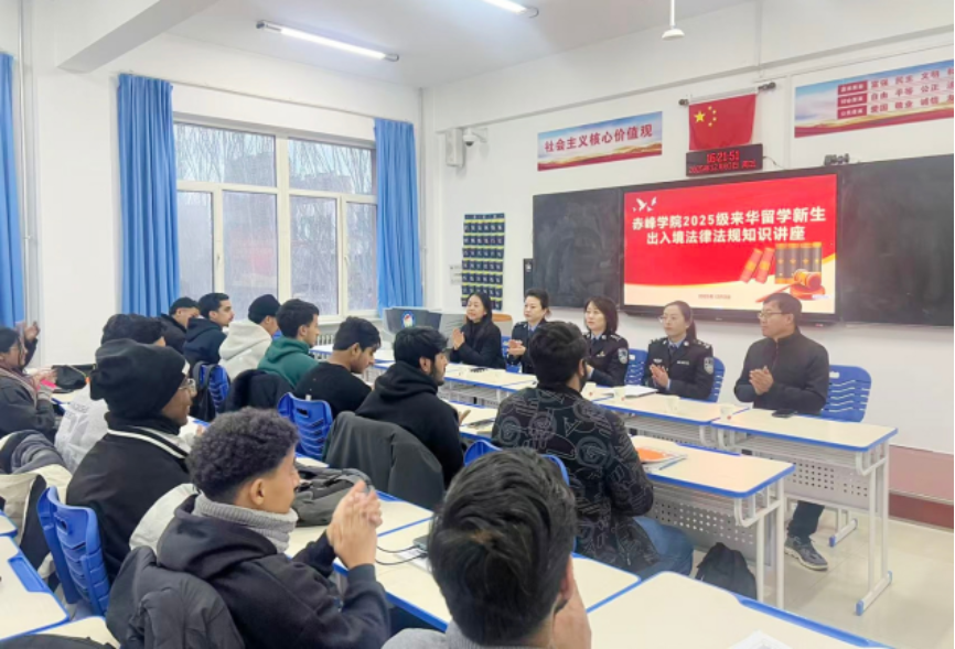 近日,赤峰学院国际教育学院联合赤峰市公安局红山分局出入境管理大队,为13个家国47名来华留学生举办“平安留学·法治同行”辅导讲座,中英双语解读出入境、治安等法规及生活安全知识,解答留学生实际困惑,增强其法律与安全意识,助力融入校园与社会。