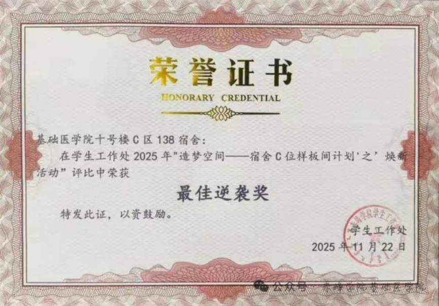 2025年11月22日,赤峰学院“焕新”宿舍改造活动中,基础医学院138宿舍获“最佳逆袭奖”。该宿舍优化空间、融入专业特色实现蜕变,分享逆袭故事树立积极典型。活动助力宿舍文化建设,基础医学院将常态化推进相关工作。