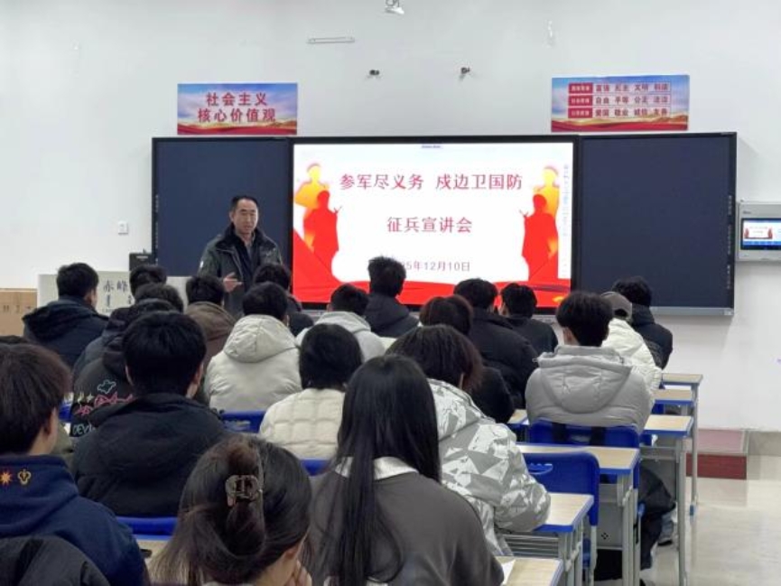 2025年12月10日下午,物理与智能制造工程学院在逸夫理工楼举办“参军尽义务,戍边卫国防”征兵宣讲会,校学生工作处老师解读征兵政策、解答疑问,激发学子参军热情。为赤峰学院征兵工作奠定基础;后续将完善宣传动员机制,为有意参军学生提供精准指导。
