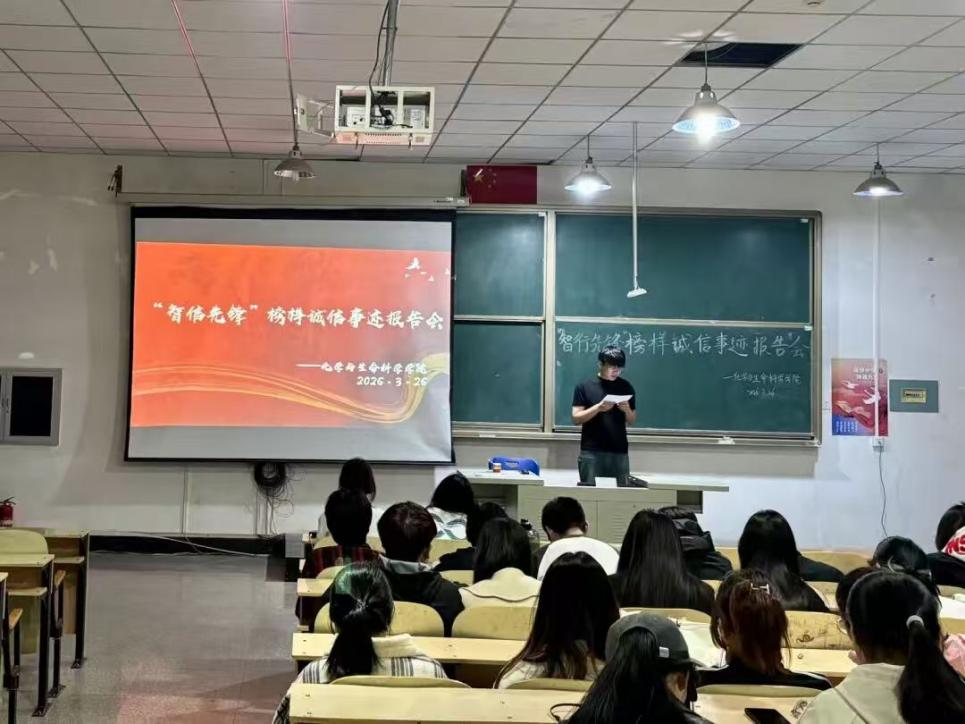 活动二:3月26日,赤峰大学化学与生命科学学院举办“智信先锋”榜样诚信事迹报告会,邀请四位奖学金获得者分享诚信成长经历,发挥榜样示范作用,引导学生树立正确价值观,营造诚信校园氛围。