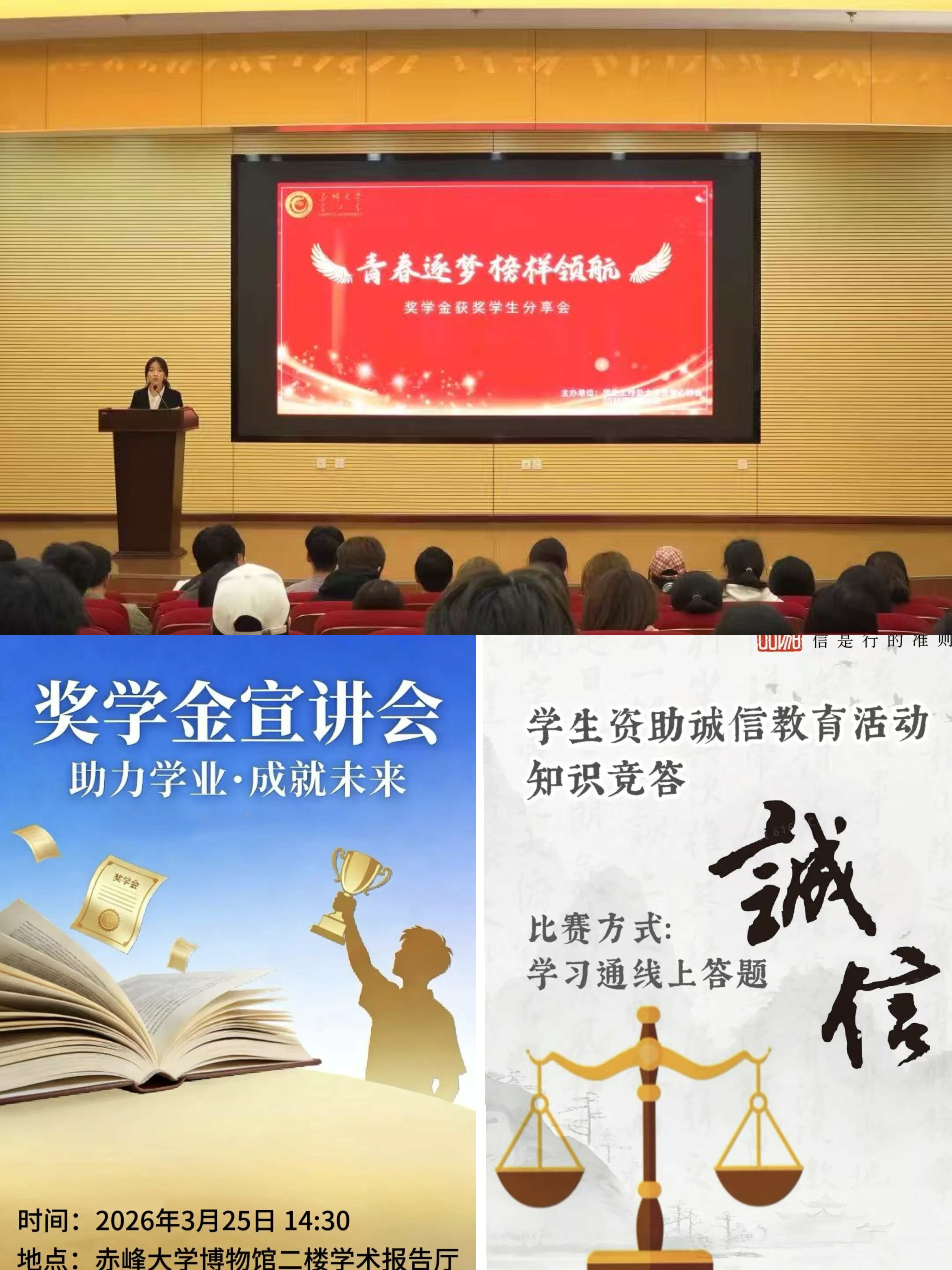 赤峰大学于3月25日举办奖学金获得者宣讲会,邀请国家奖学金、自治区奖学金等多项荣誉获得者分享奋斗故事与学习经验,五位不同学院的获奖代表分享学习经历与心得,展现脚踏实地的求学精神,发挥榜样引领作用,助力学子解锁高效成长指南、营造优良学风;3月22日至29日,学校开展学生诚信教育主题月知识竞答,旨在增强学子诚信意识,学习征信、资助、学术规范等知识,参与者需通过学习通报名参与、诚信应考。